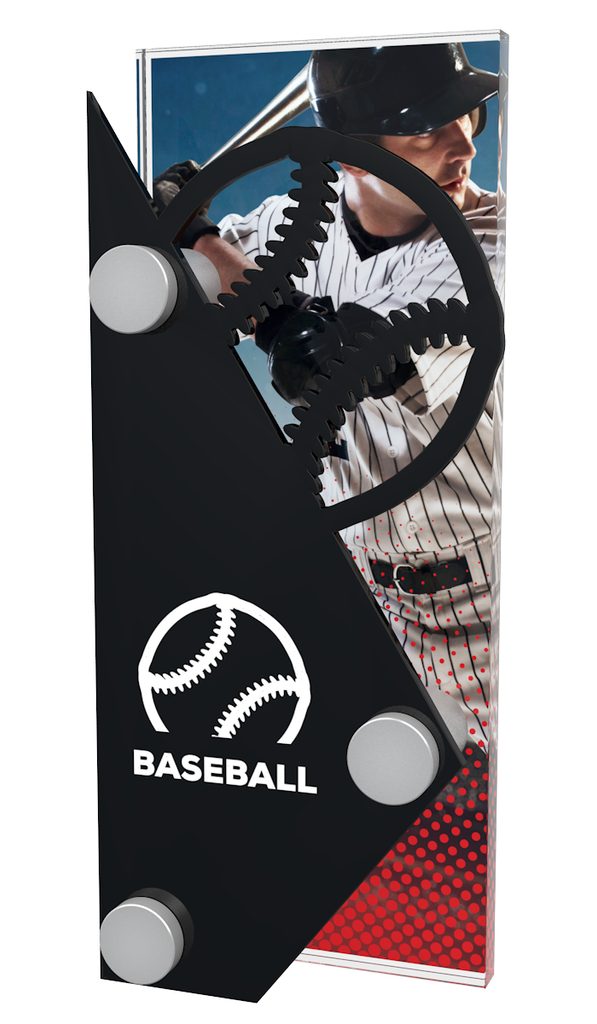 The Salzburg Baseball Trophy is made from two pieces of acrylic. These are connected by using three steel screw fittings. The back piece is a 10mm thick piece of high quality printed acrylic, and the front piece is laser cut black acrylic.