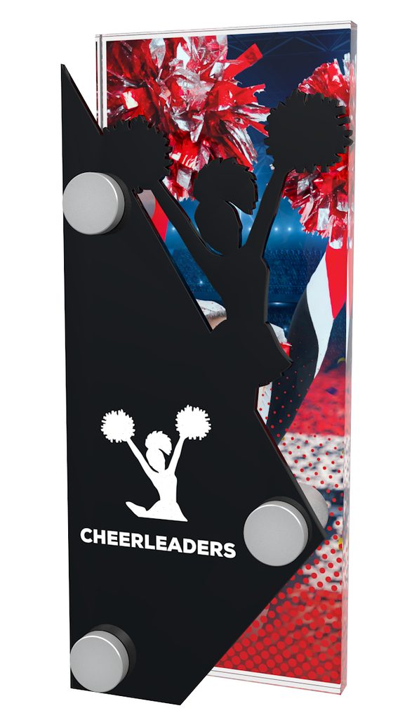 The Salzburg Cheerleader Trophy is made from two pieces of acrylic. These are connected by using three steel screw fittings. The back piece is a 10mm thick piece of high quality printed acrylic, and the front piece is laser cut black acrylic.