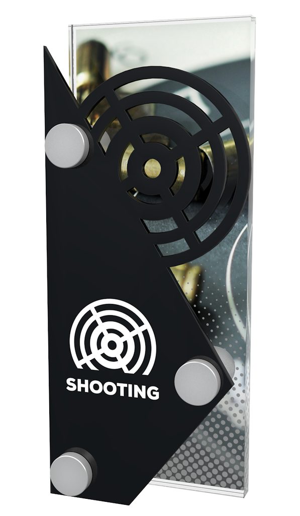 The Salzburg Shooting Trophy is made from two pieces of acrylic. These are connected by using three steel screw fittings. The back piece is a 10mm thick piece of high quality printed acrylic, and the front piece is laser cut black acrylic.