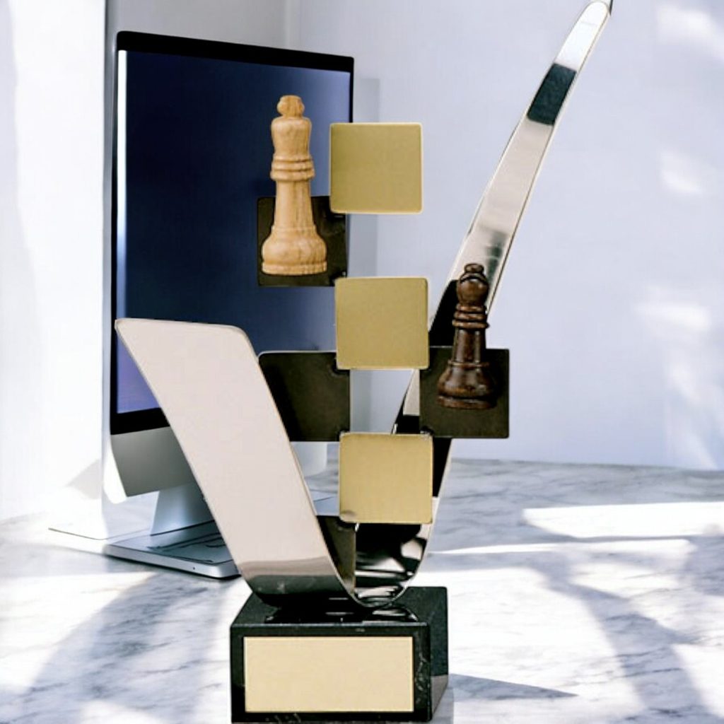 Crafted with precision from high-quality metals, including brass and nickel, the Sanguesa Chess Trophy boasts a modern and elegant design. Its solid marble base provides both durability and a refined aesthetic, ensuring this award stands out in any collection.