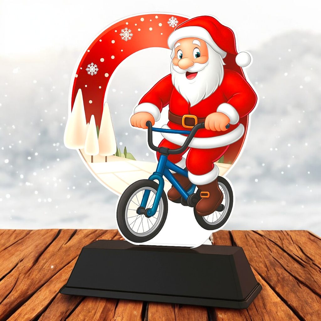 The Santa BMX Christmas Trophy is a fun and festive award ideal for BMX clubs, riders, and Christmas competitions. Featuring Santa catching some air on his BMX, this colourful trophy is cut to shape from 4mm acrylic and mounted on a solid black PVC base.