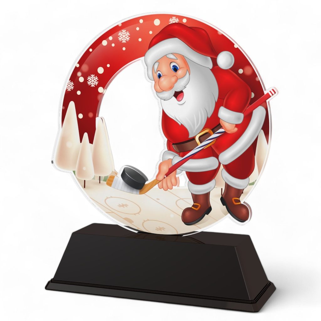 Santa Ice Hockey Christmas Trophy is a vibrant low cost award with cutting edge design. Cut out to shape this trophy features a high quality full colour print on the reverse side of the 4mm thick acrylic mounted on a weighted black PVC base. Choose from 4 sizes.