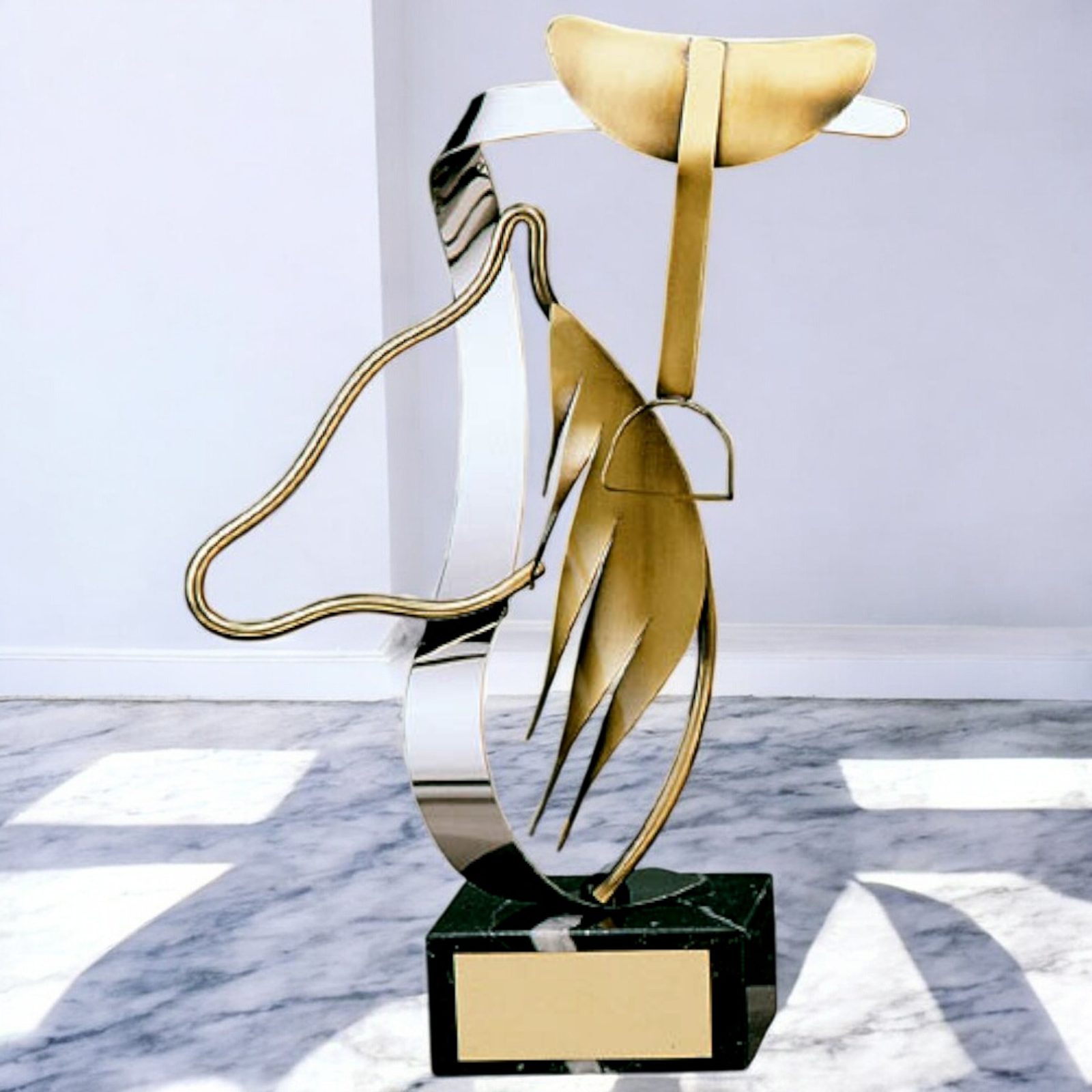 Crafted from high-quality metals, including brass and nickel, the Segura Horse Riding Trophy showcases a sophisticated and contemporary design. The solid marble base provides stability and a refined finish, ensuring this trophy stands out as a prestigious addition to any award collection.