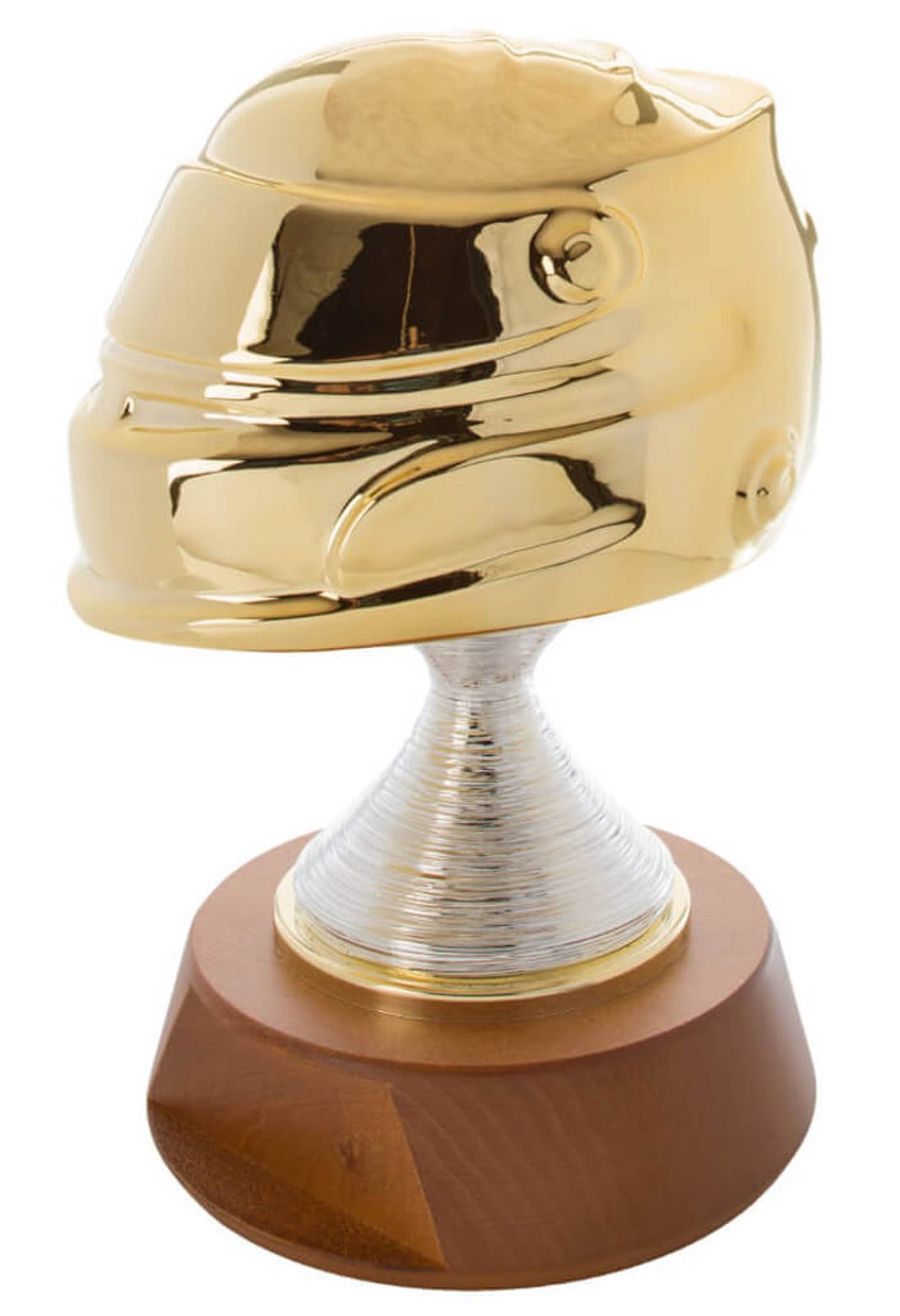 The Senna Motorsport Ceramic Helmet Trophy is an exclusive award displaying a gold ceramic helmet. This is then mounted onto a high quality circular cherry wooden base. This item is part of an exclusive collection that are made in Italy.