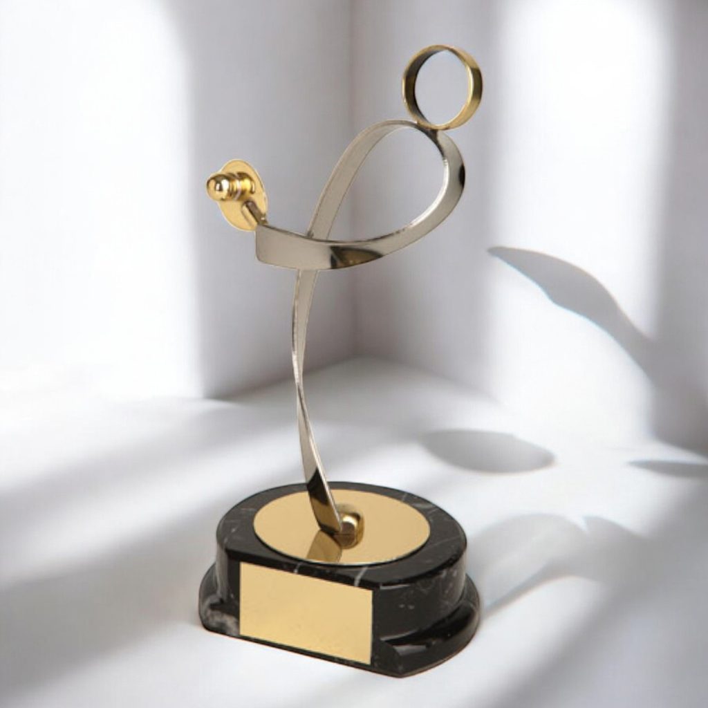 Presenting the remarkable Sevilla Trophy—a finely crafted metal award that embodies grace and sophistication. This exclusive piece is elegantly set on a distinctive marble effect wooden base, adding a refined touch of luxury to any setting.
