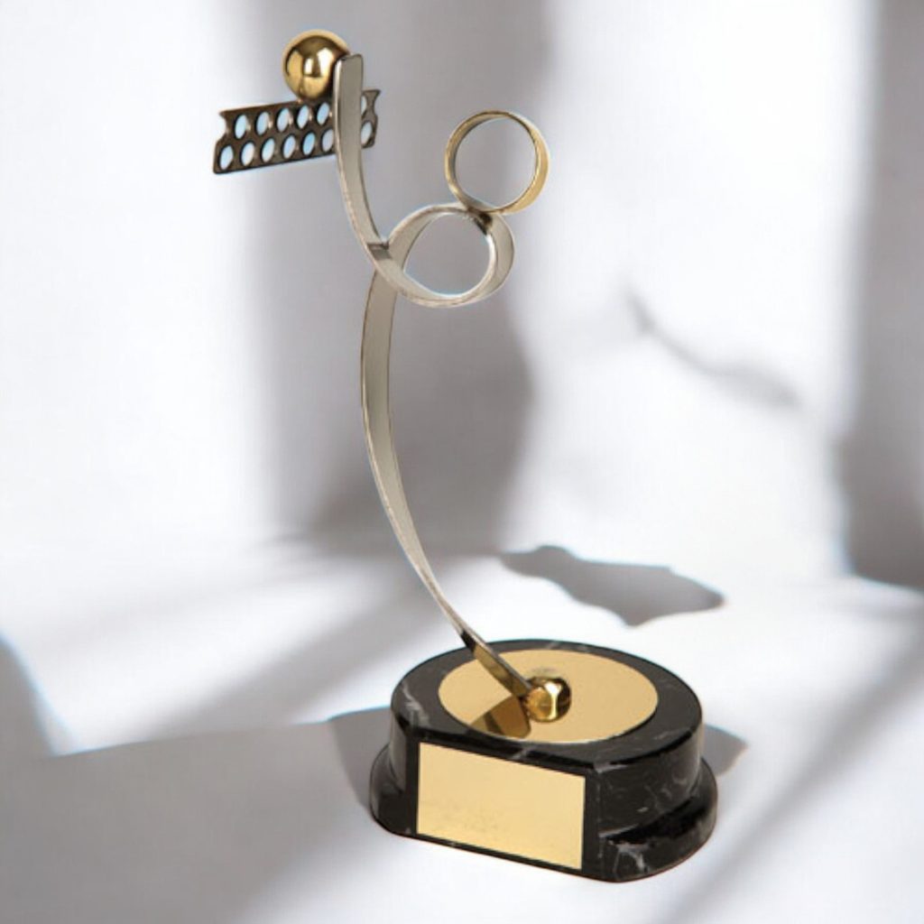 Presenting the remarkable Sevilla Trophy—a finely crafted metal award that embodies grace and sophistication. This exclusive piece is elegantly set on a distinctive marble effect wooden base, adding a refined touch of luxury to any setting.