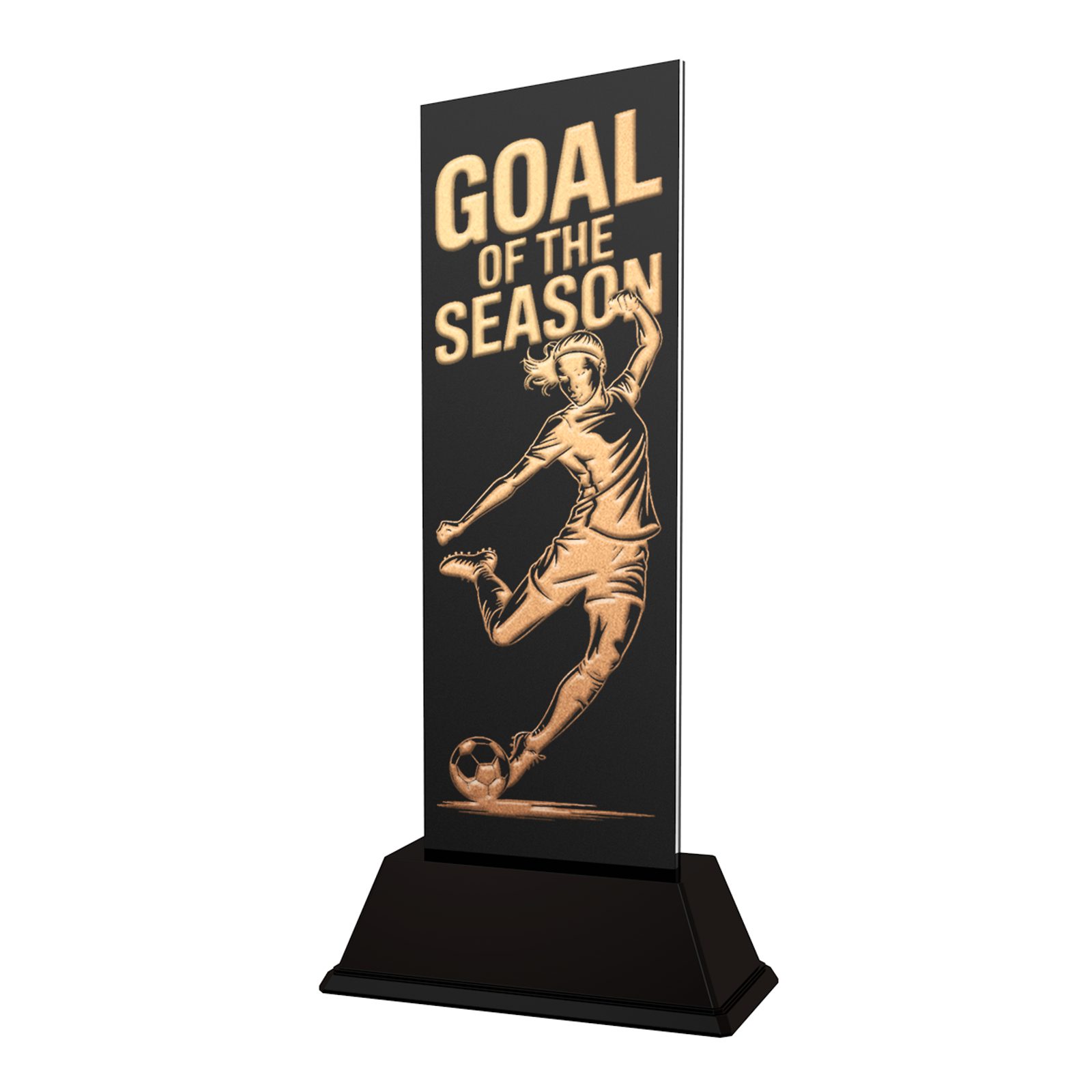 Celebrate the unforgettable moments that define a football season with the Shadowline Football Female Goal of the Season Trophy — a contemporary award created to recognise the player who scored the most memorable goal of the campaign.