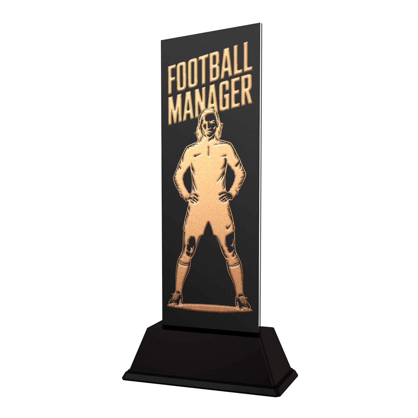 The tall silhouette is available in three sizes — 200mm, 210mm, and 220mm — making it ideal for end-of-season presentations, football club awards nights, and league recognition events. Free personalised engraving is included as standard, allowing you to add manager names, seasons, or competition titles at no additional cost.