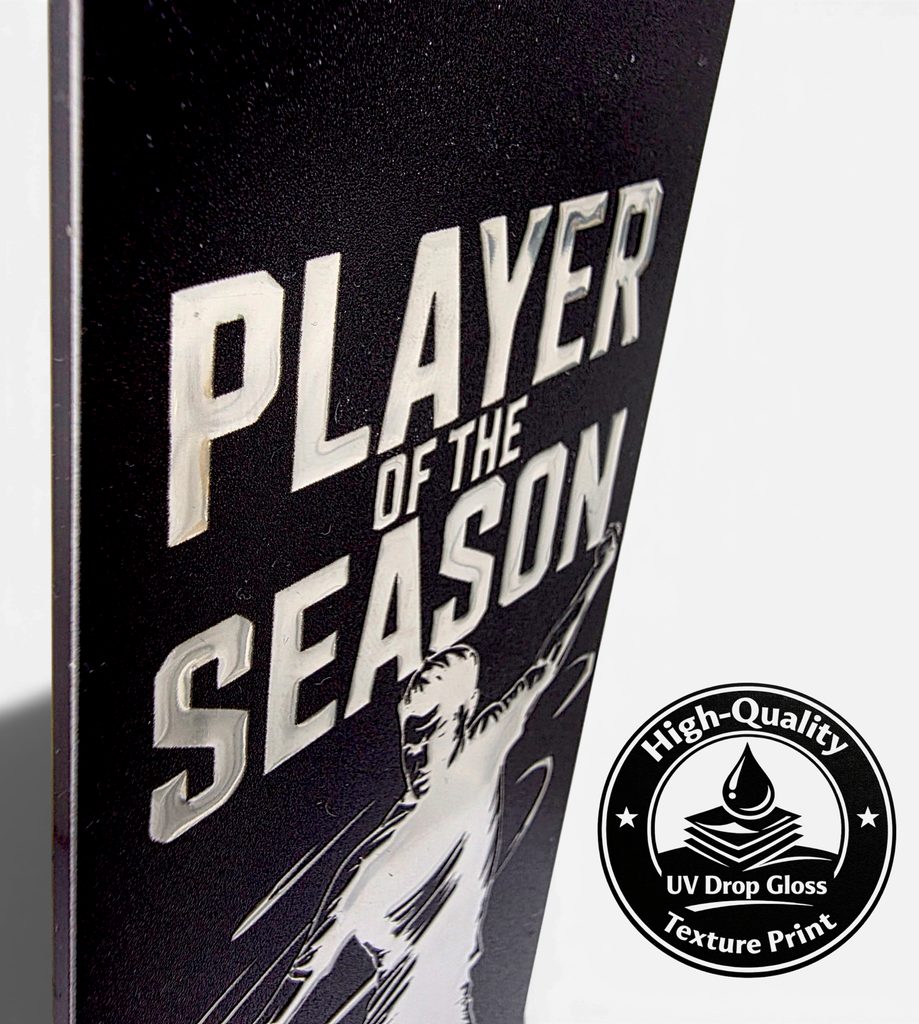 The design is enhanced using a high-quality drop gloss print, creating a raised metallic texture that catches the light beautifully. With ten colour options available, the trophy can easily be matched to club colours, team identity, or presentation themes.