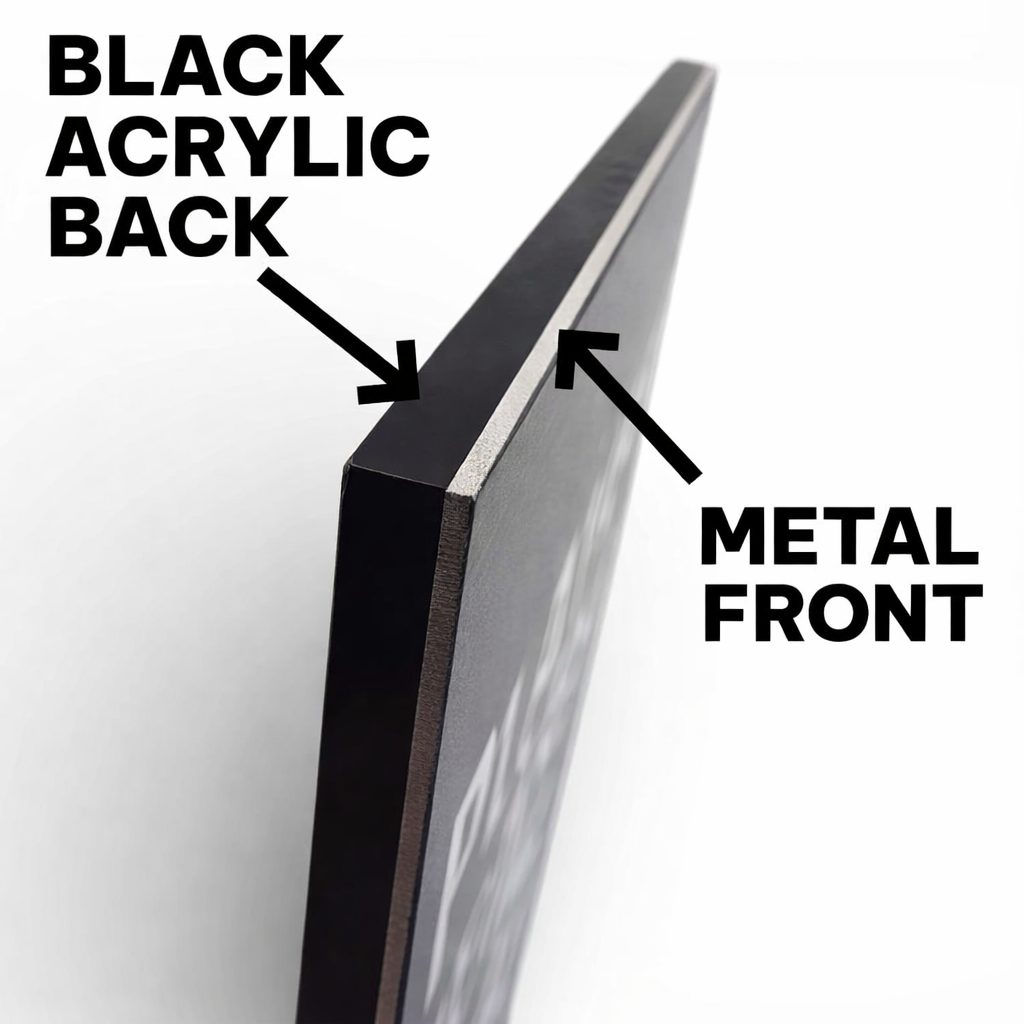 Each trophy features a 1.5mm stainless steel face with a refined matt titanium effect, securely mounted to a 3mm black acrylic backing. This layered construction creates depth and a strong, structured silhouette that stands out during awards ceremonies.