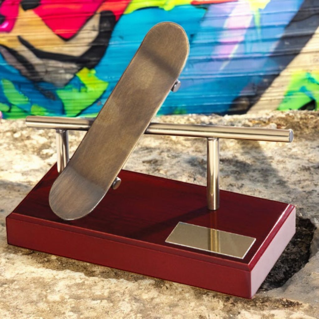 Presenting the elegant Mullen Skateboard Street Trophy—a superbly handcrafted metal award that exudes grace and distinction. Set on a luxurious wooden base, this trophy adds a refined presence to any setting.