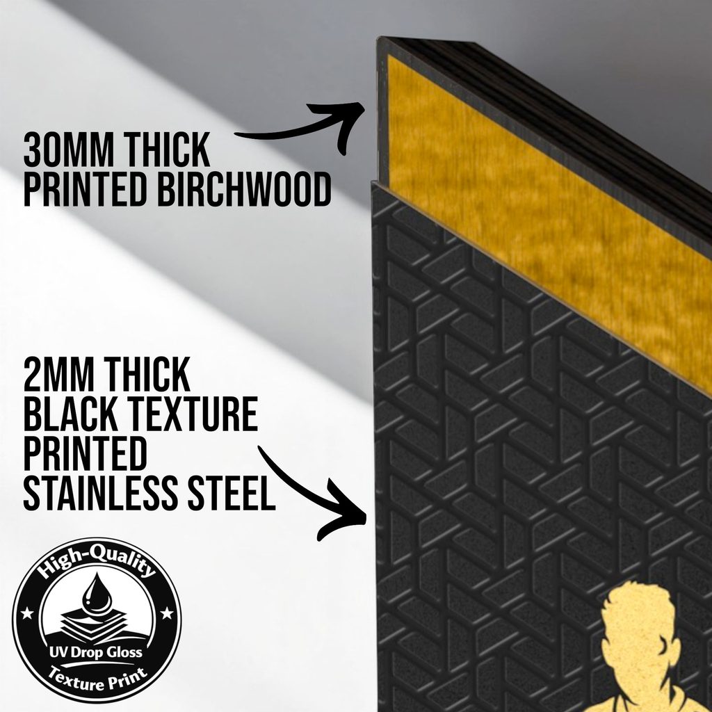 The 2mm stainless steel layer is enhanced with a textured black drop gloss print, creating depth, contrast and a premium finish that stands out at any presentation.