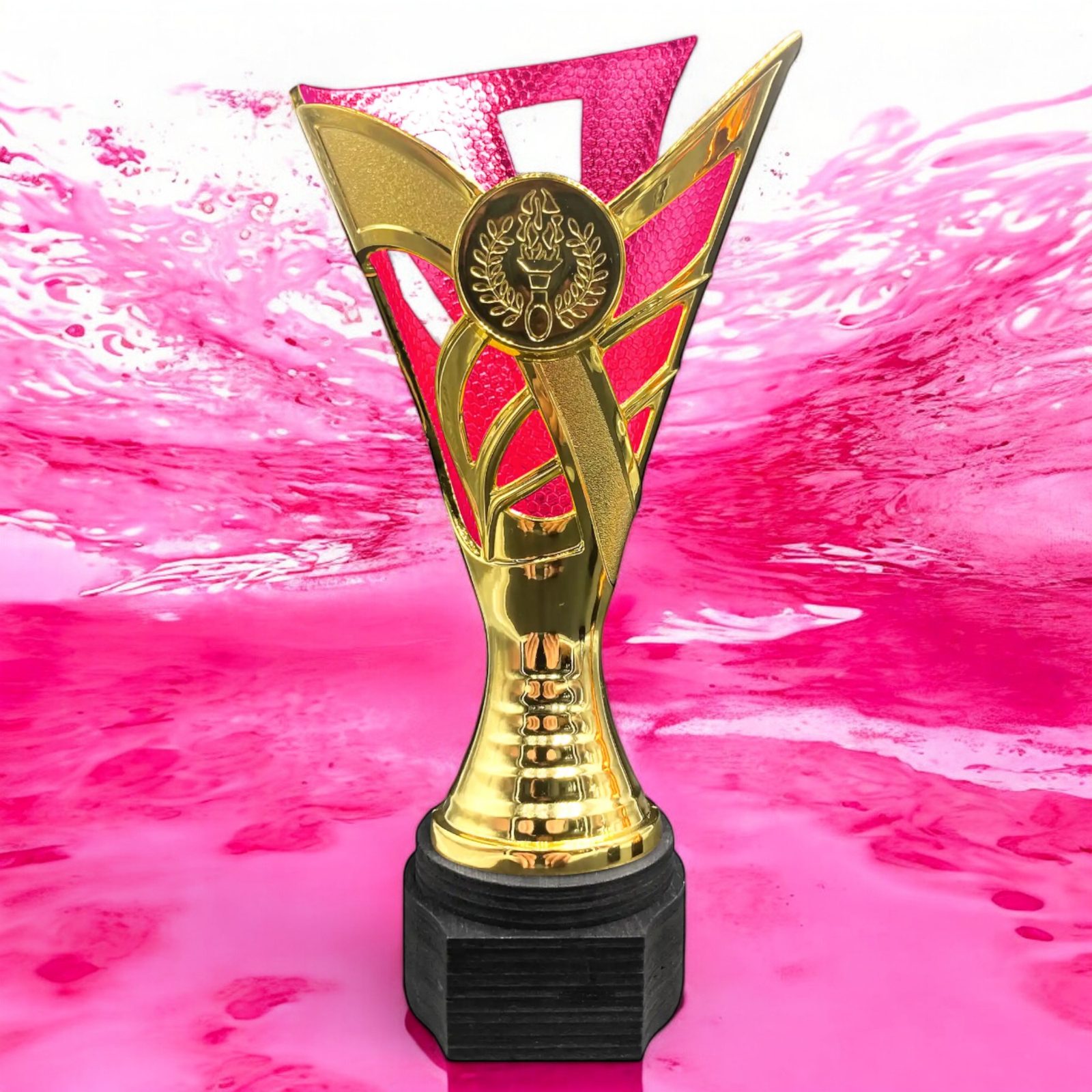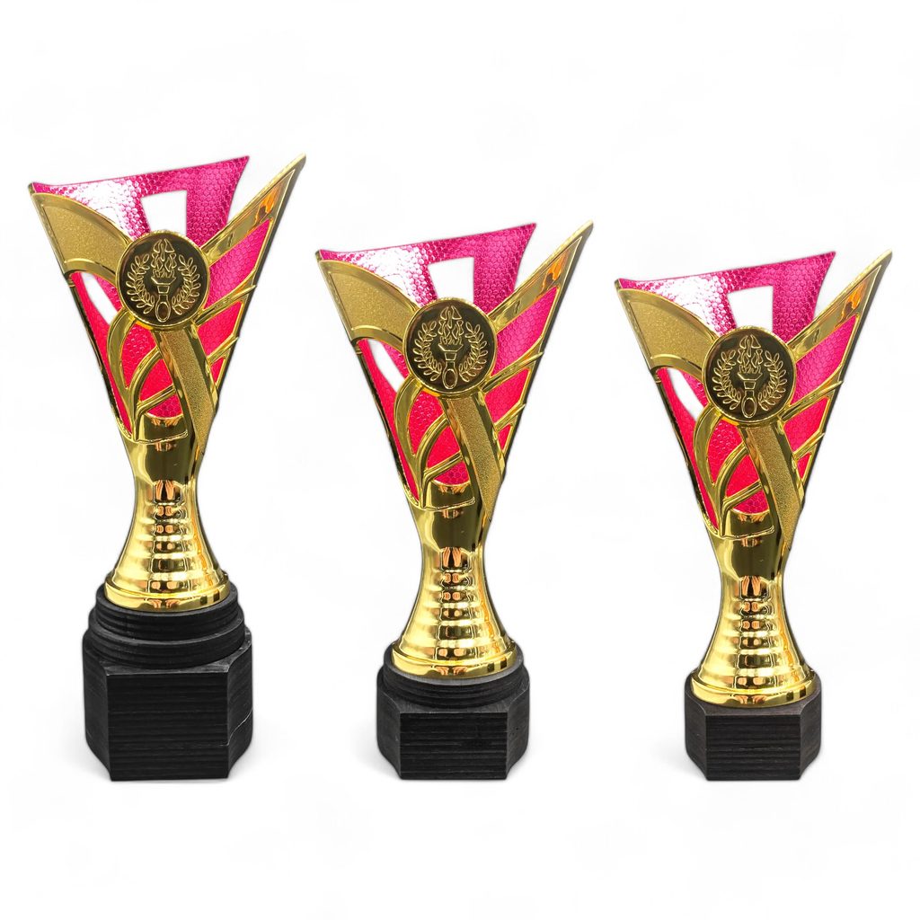 The Tewin Gold & Pink Laser Cup is a stunning award that is made from plastic then mounted on an exclusive handmade birch wood base, which adds a touch of elegance and sophistication to the overall design.