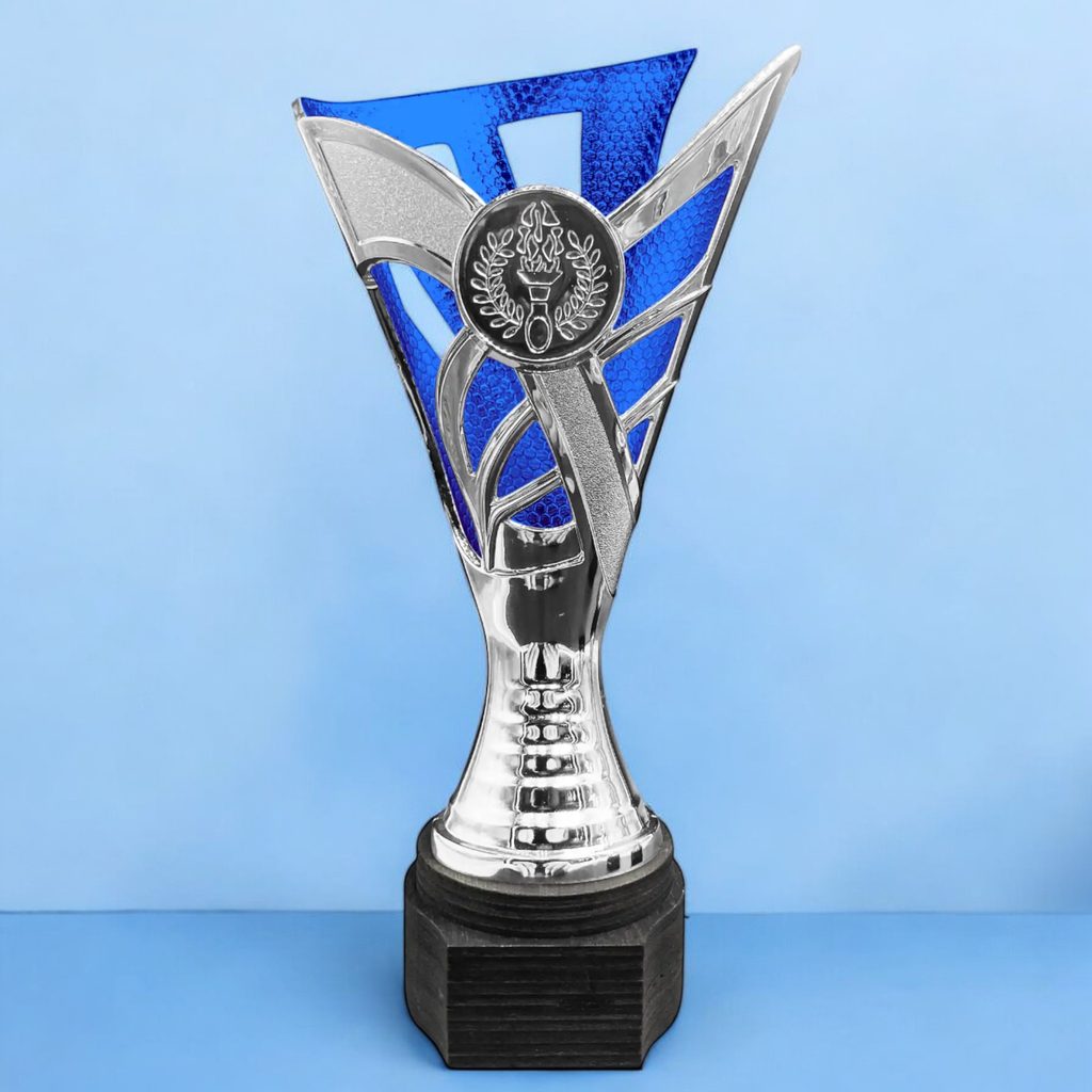 The Tewin Silver & Blue Laser Cup is a stunning award that is made from plastic then mounted on an exclusive handmade birch wood base, which adds a touch of elegance and sophistication to the overall design.