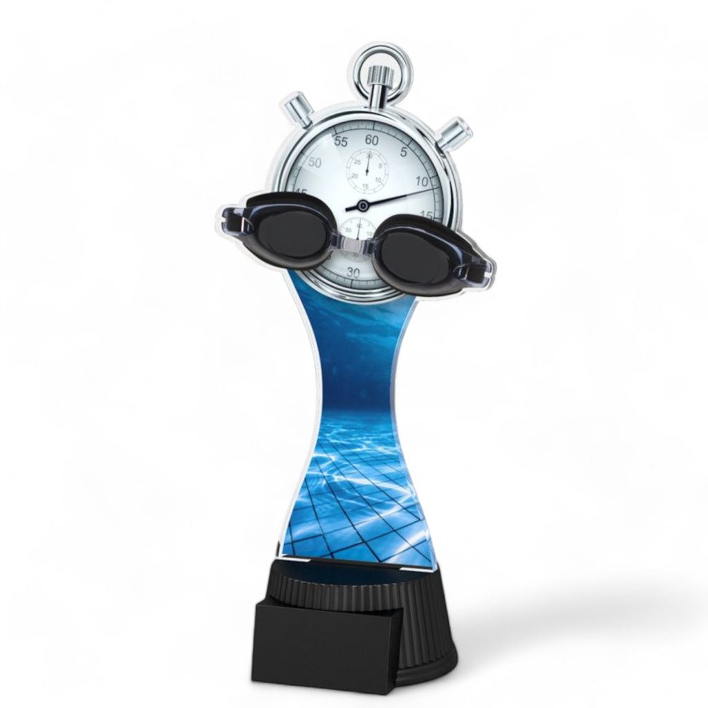 The Toronto Swimming Goggles and Stopwatch Trophy is a sleek and contemporary award, designed to make a bold statement at any presentation. With its modern silhouette and eye-catching design, this trophy is the perfect way to honour outstanding achievements in sports, business, and beyond.