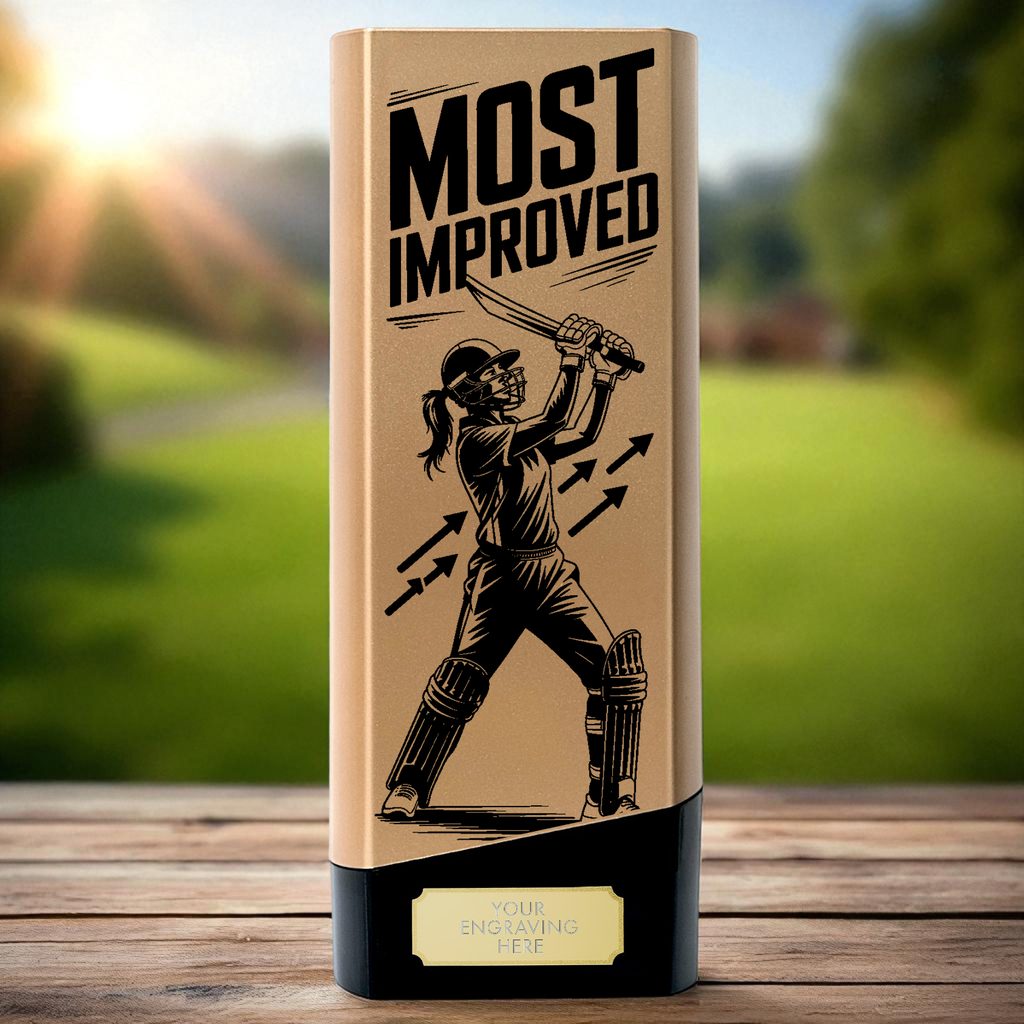 The Tower Elite Heavyweight Women’s Most Improved Player Cricket Trophy is a bold, contemporary award created to recognise dedication, hard work, and clear progress throughout the season. With its heavyweight design and specialist cricket print, it honours the players who have taken their game to the next level. Every trophy includes a free engraved text plate.