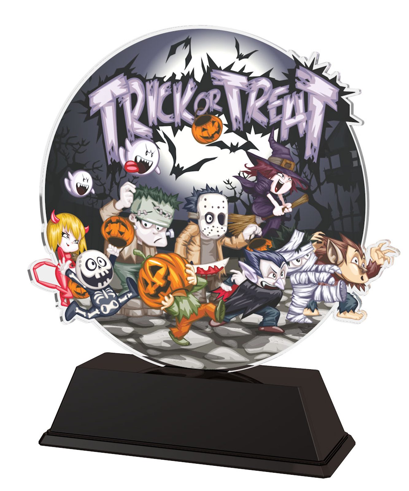 Trick or Treat Ghosts n Ghouls Trophy is a very scary award indeed. Cut to shape this trophy features a high quality full colour print on