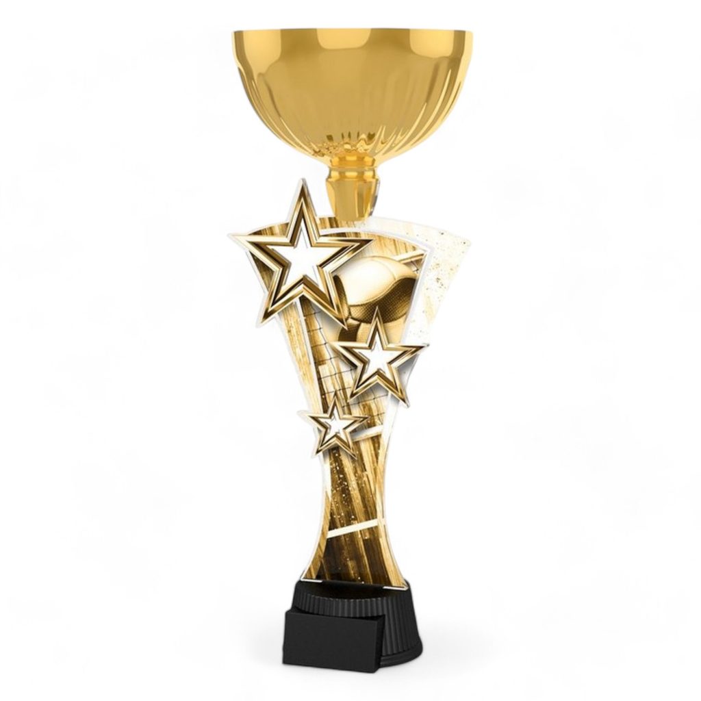 The Triple Star Classic Volleyball Gold Trophy Cup is an eye-catching award with a dynamic and bold design.