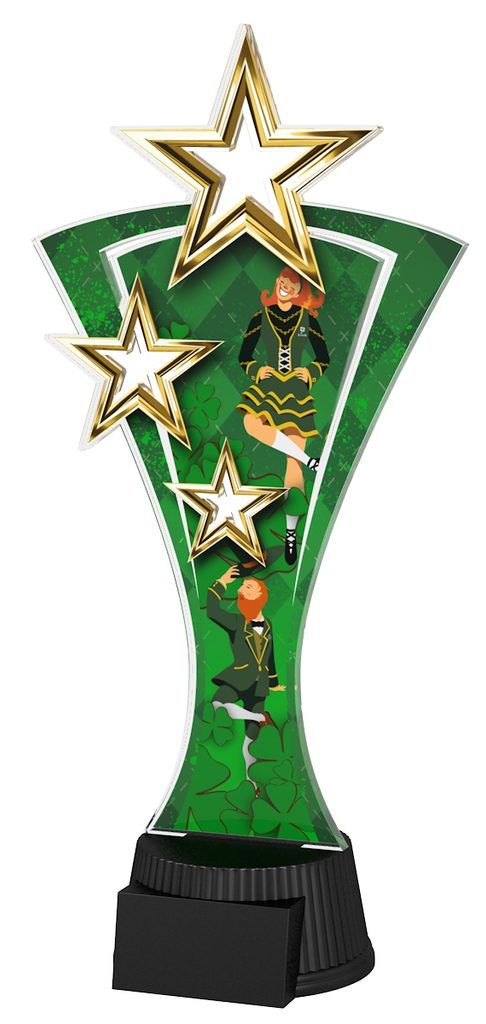 The Triple Star Irish Dance Trophy is an eye-catching award with a dynamic and bold design.