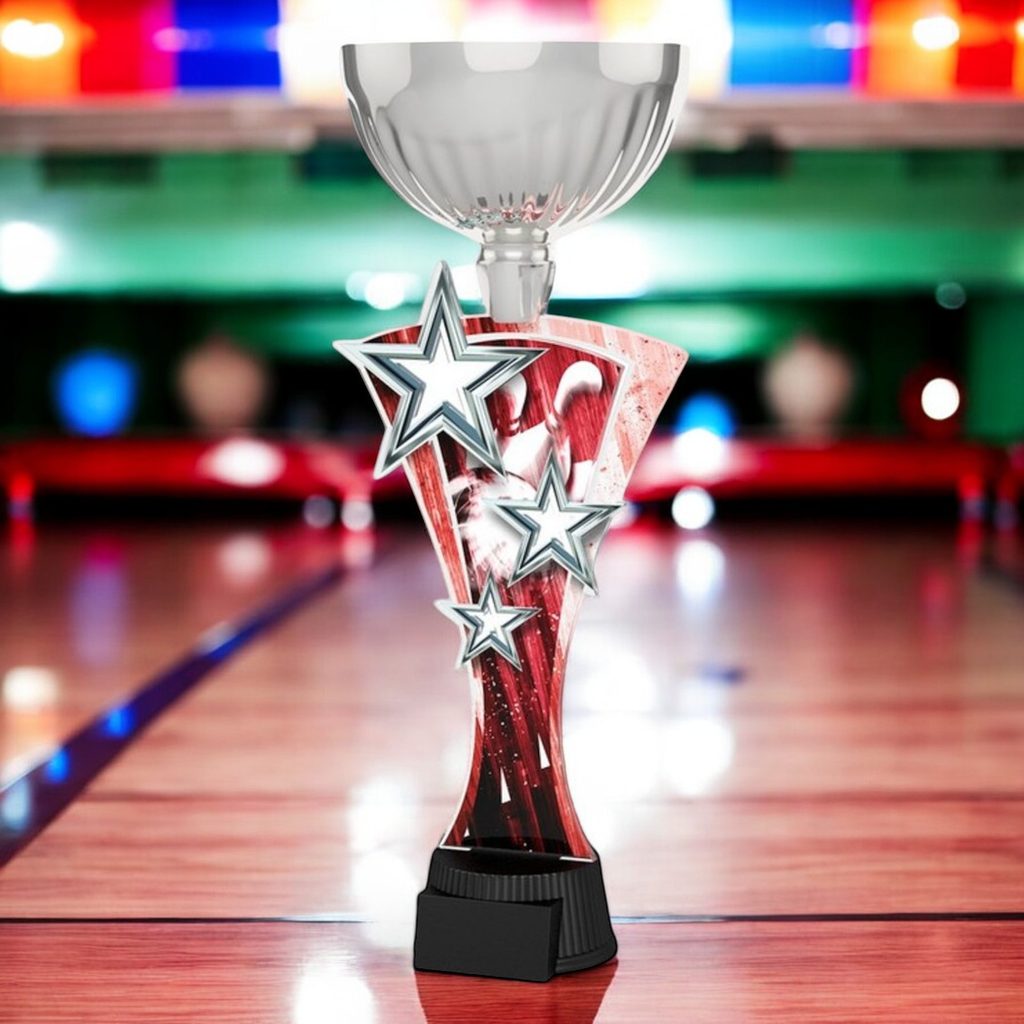 The Triple Star Tenpin Bowling Silver Trophy Cup is an eye-catching award with a dynamic and bold design.