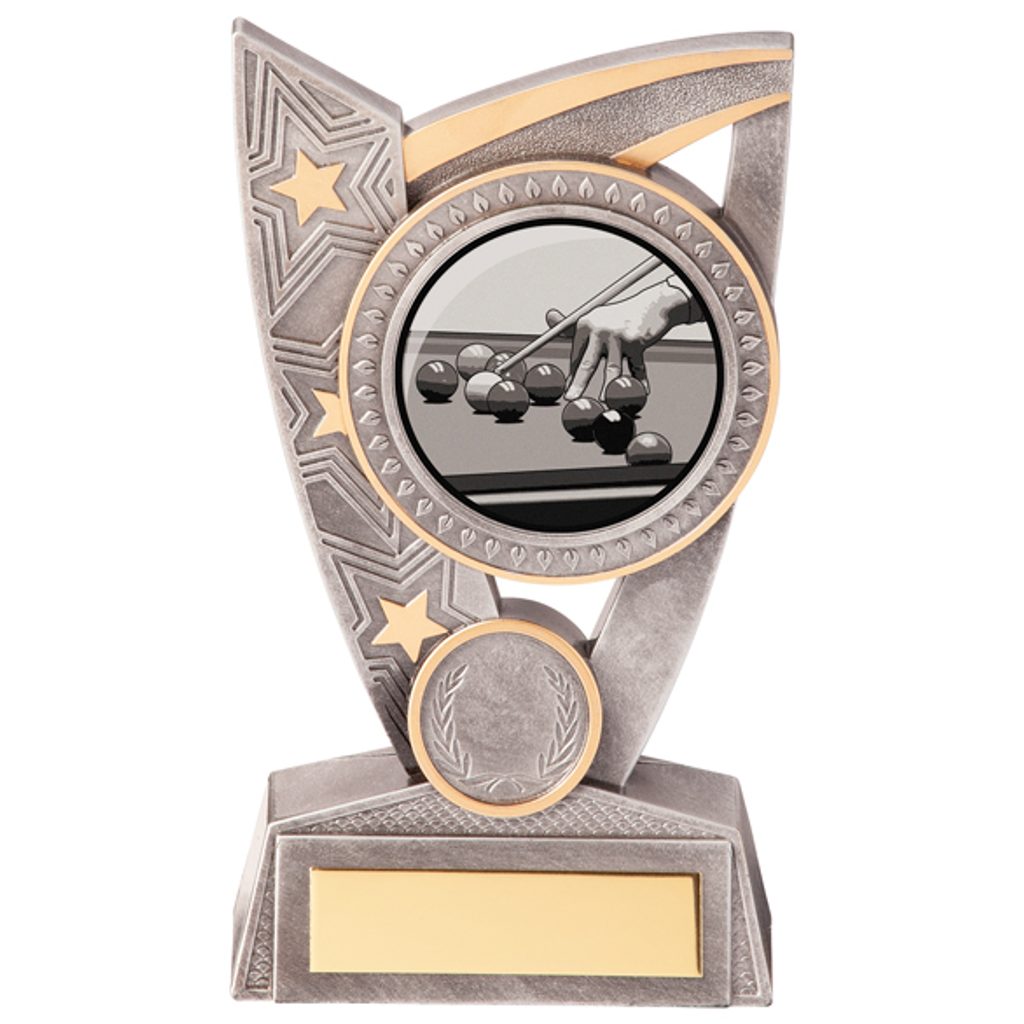The Triumphant Snooker Trophy is a high definition design made from top quality plastic, with beautifully displayed detail. Glazed in a stunning colour mix of antique silver and gold.