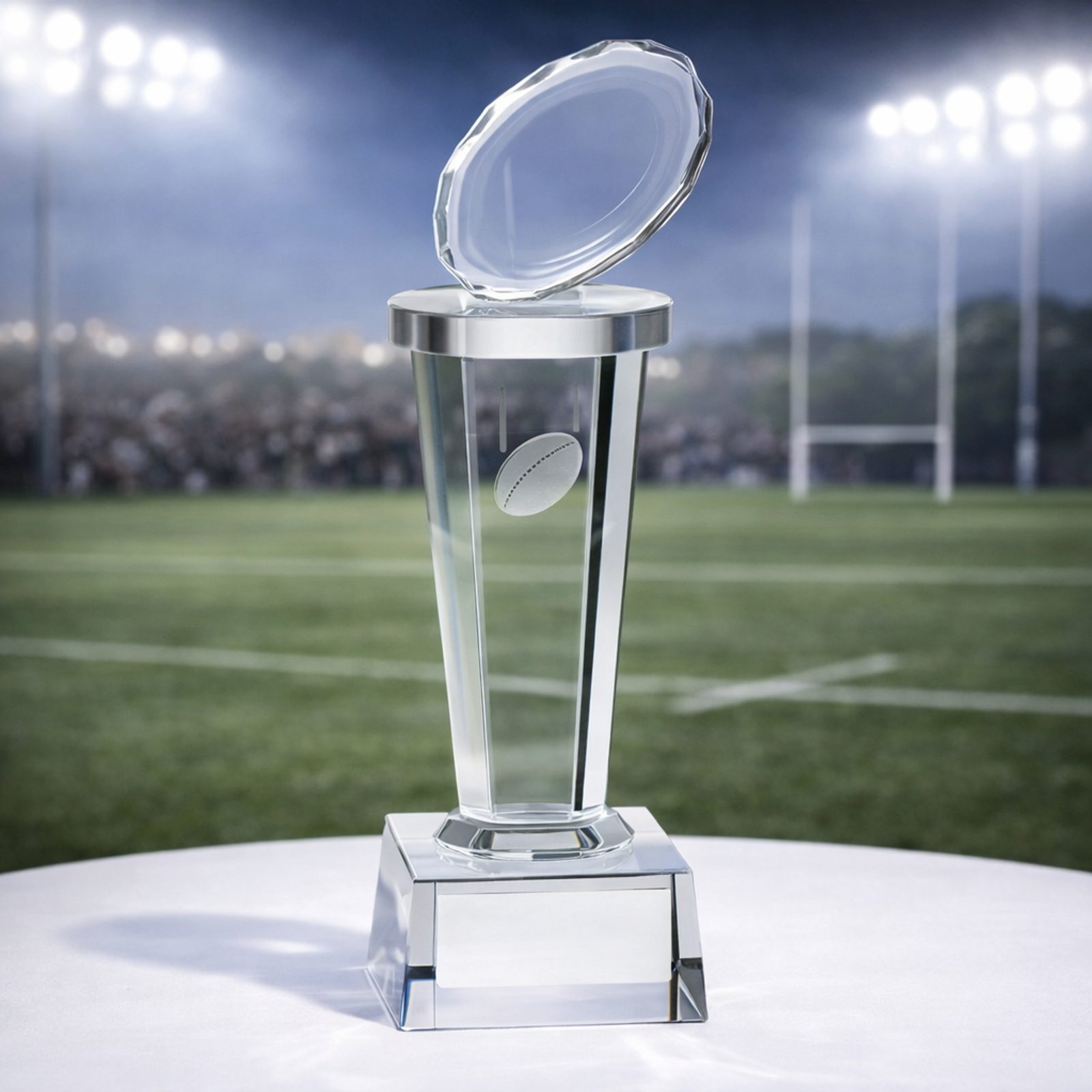 Premium glass rugby trophy – elegant design with a cut glass rugby ball top