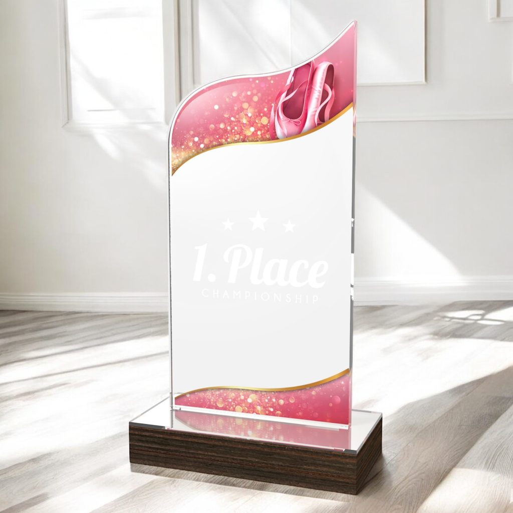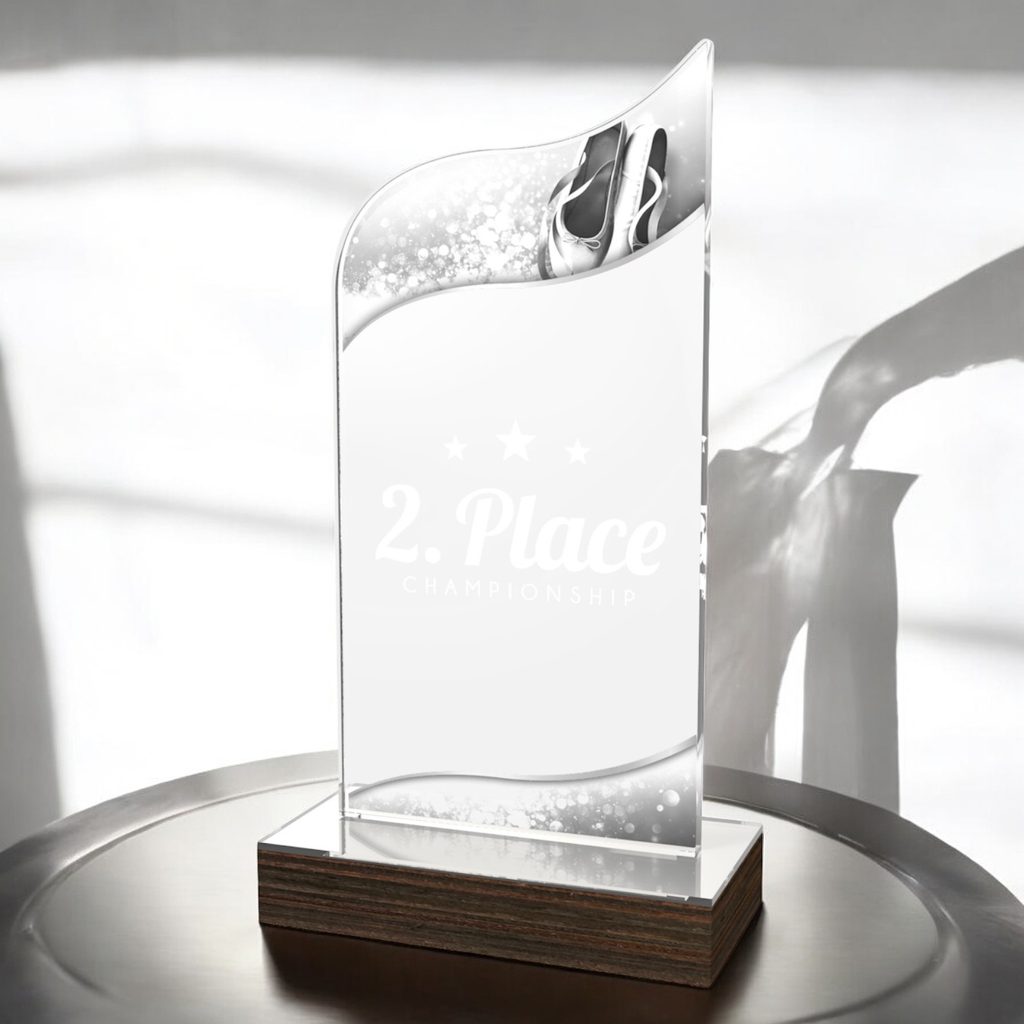 The United Ballet Acrylic Wood Fusion Trophy Trophy blends contemporary elegance with a bold acrylic design, making it a striking choice for any recognition.