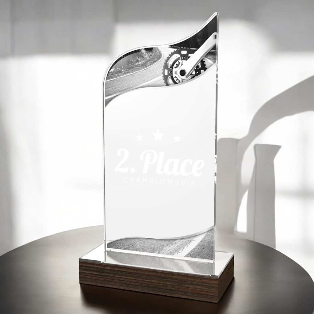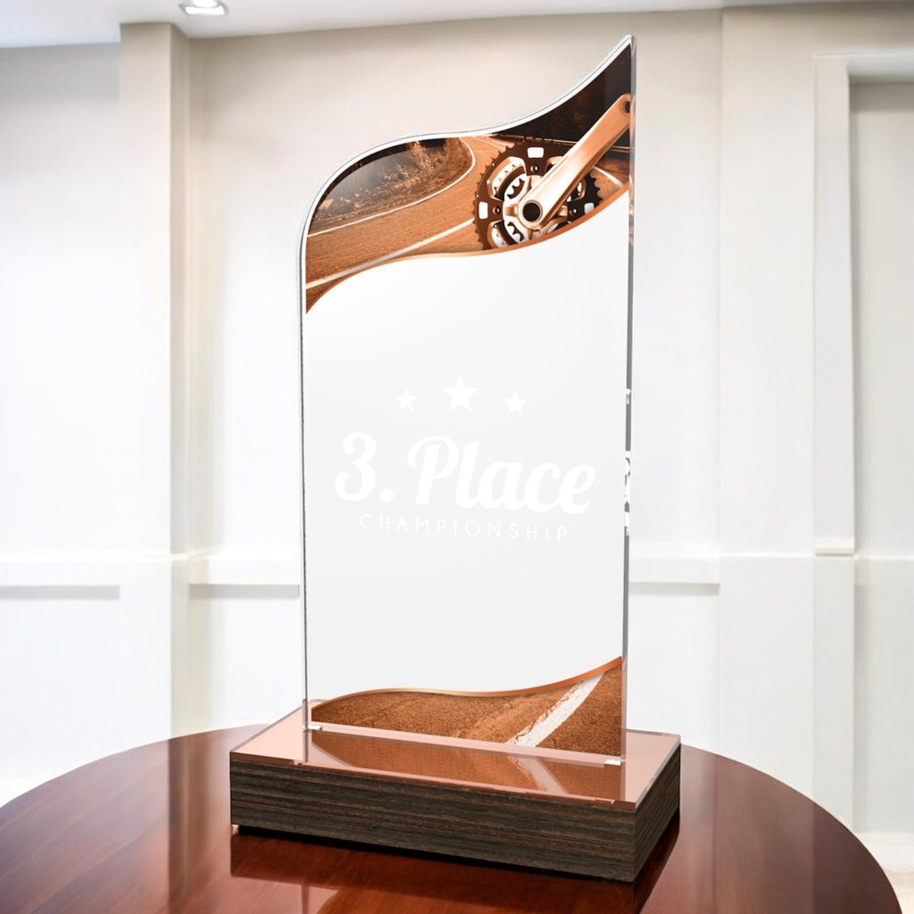 The United Cycling Acrylic Wood Fusion Trophy Trophy blends contemporary elegance with a bold acrylic design, making it a striking choice for any recognition.
