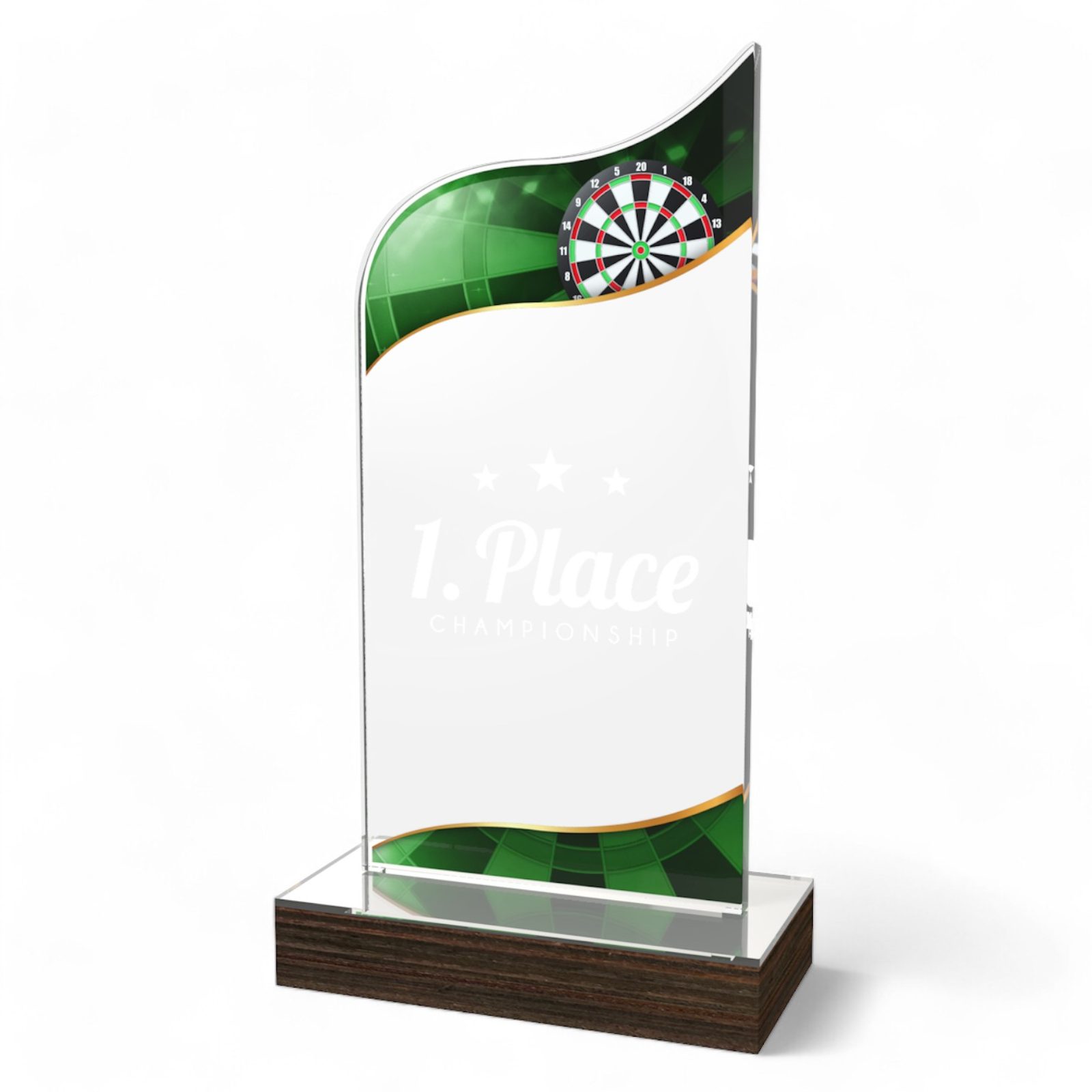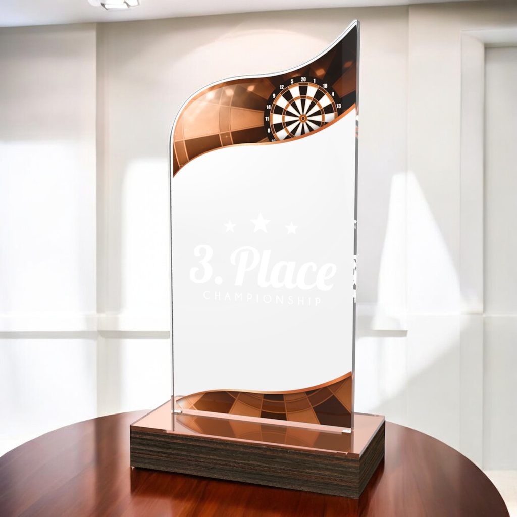 The United Darts Acrylic Wood Fusion Trophy Trophy blends contemporary elegance with a bold acrylic design, making it a striking choice for any recognition.