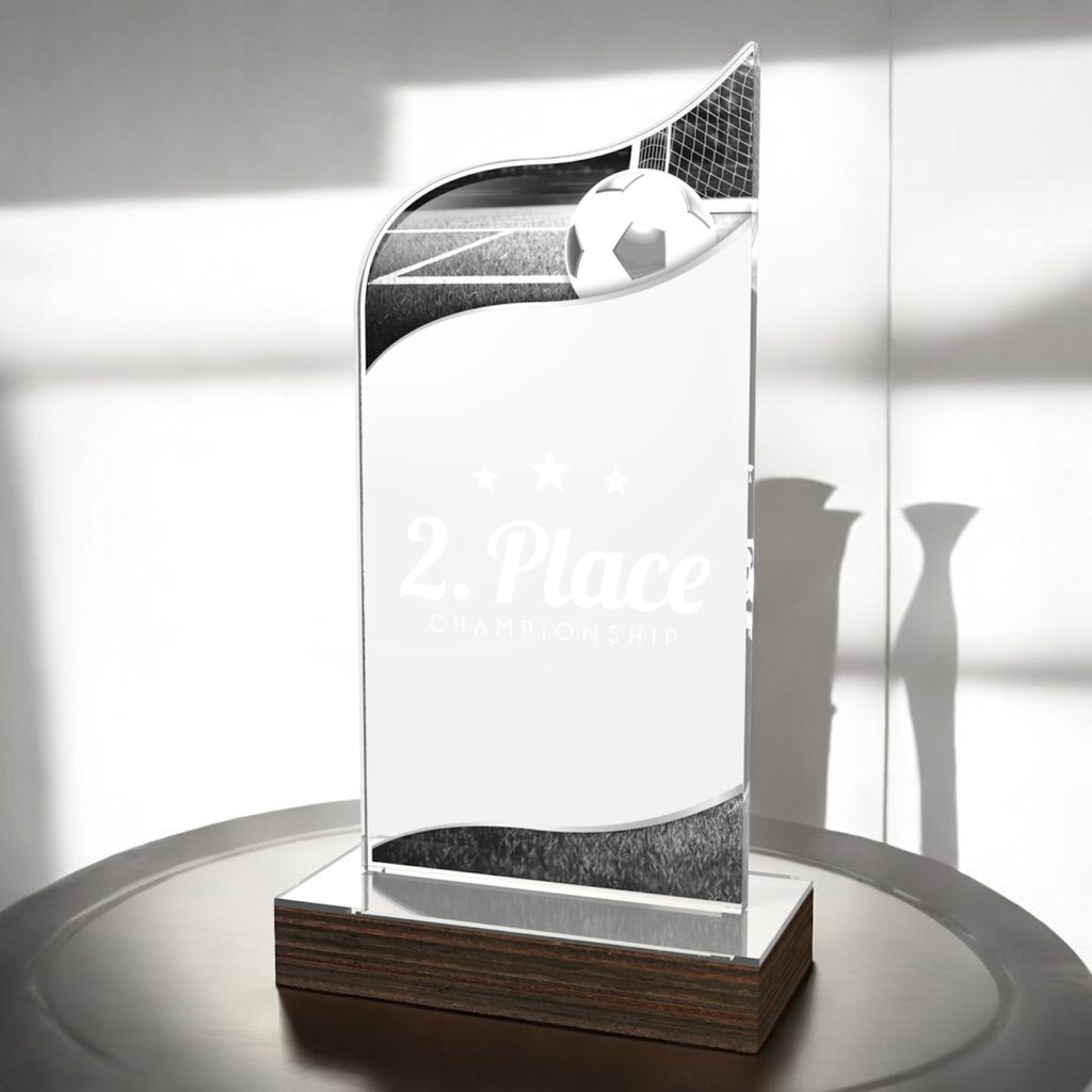 The United Football Acrylic Wood Fusion Trophy Trophy blends contemporary elegance with a bold acrylic design, making it a striking choice for any recognition.