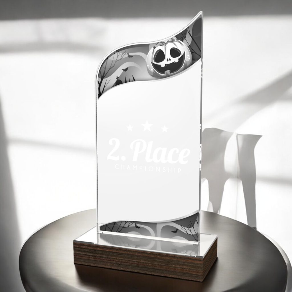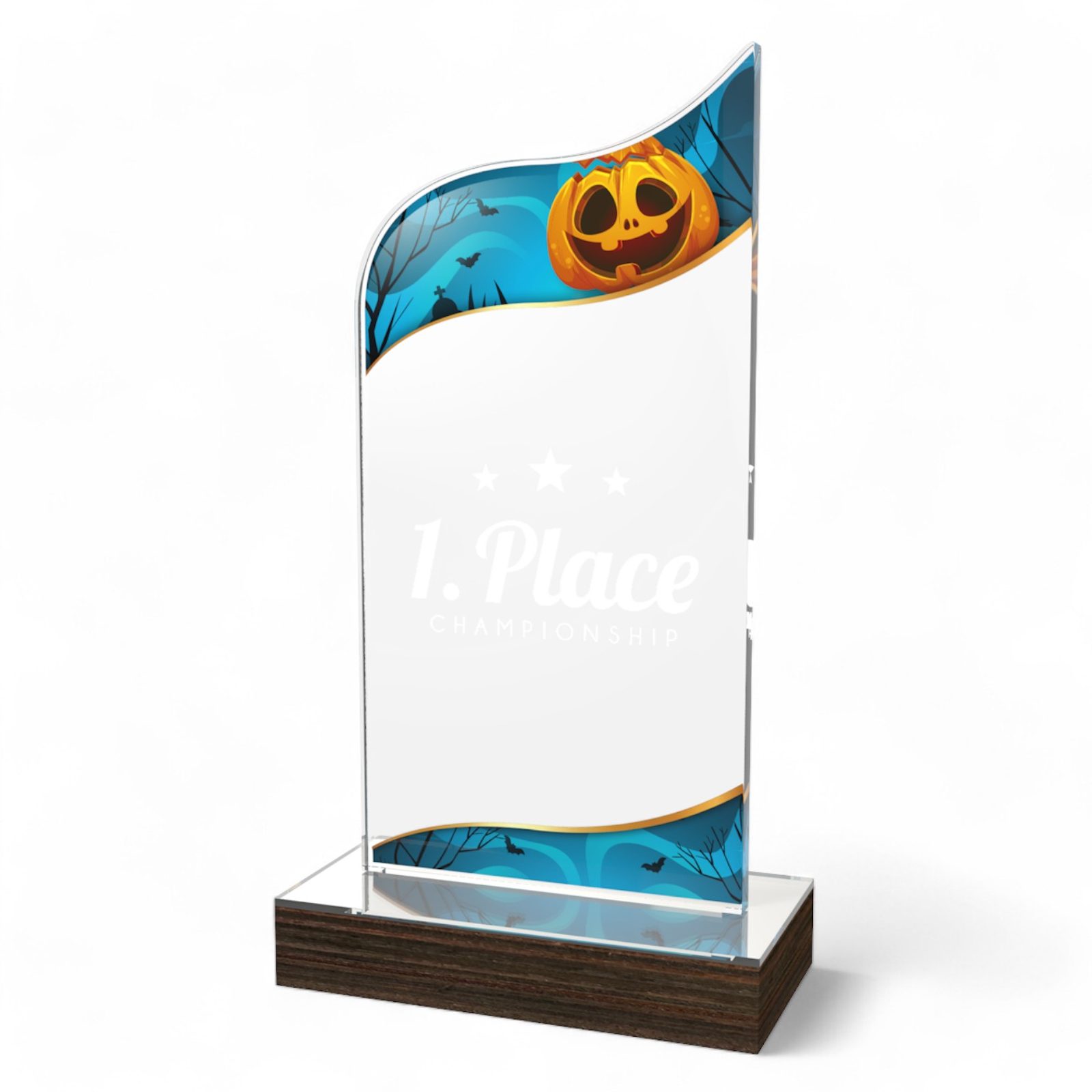 The United Halloween Acrylic Wood Fusion Trophy Trophy blends contemporary elegance with a bold acrylic design, making it a striking choice for any recognition.