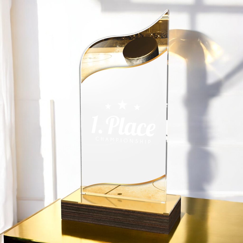 The United Ice Hockey Acrylic Wood Fusion Trophy Trophy blends contemporary elegance with a bold acrylic design, making it a striking choice for any recognition.