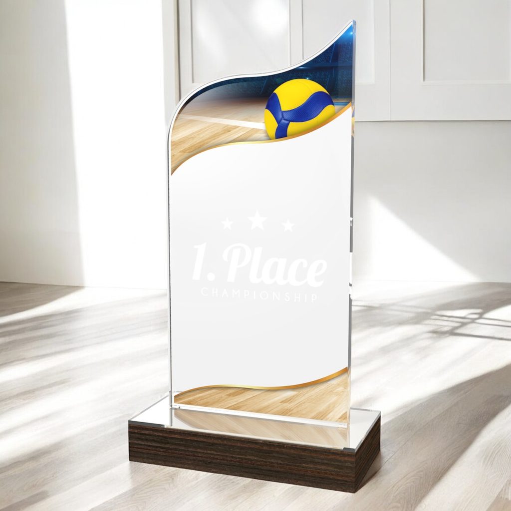 The United Volleyball Acrylic Wood Fusion Trophy Trophy blends contemporary elegance with a bold acrylic design, making it a striking choice for any recognition.