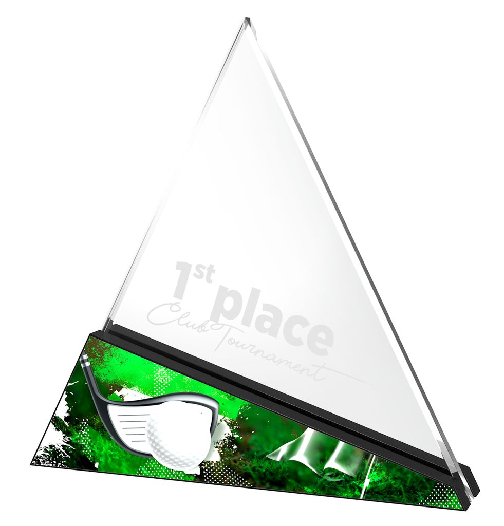 The Urban Printed Acrylic Golf Award is a truly ingenious new in-house designed trophy. This award is made using 10mm thick premium acrylic mounted in-between two pieces of shaped black 10mm thick acrylic. This gives the trophy a very professional sturdy base.