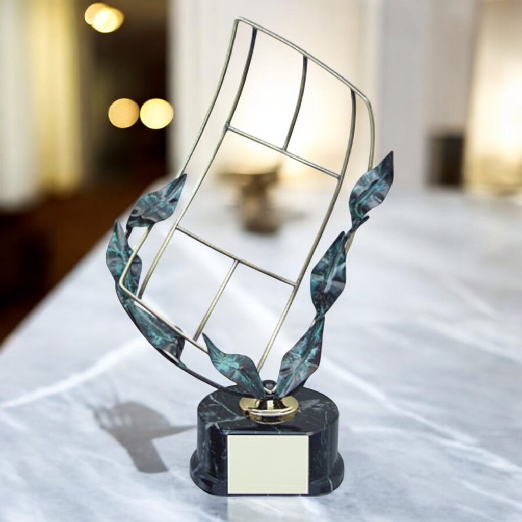 Introducing the Utrera Tennis Court Trophy—an exclusive, handcrafted award featuring a tall, golden tennis court design nestled atop an eye-catching green laurel. This elegant composition is mounted on a marble-effect wooden base, combining timeless style with athletic spirit.