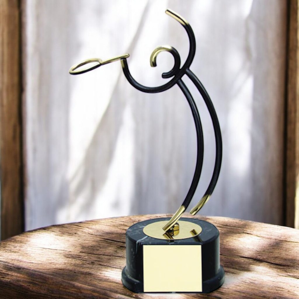 Introducing the exquisite Valencia Tennis Trophy, a meticulously handcrafted metal award that exudes elegance and sophistication. This exclusive trophy is expertly mounted on a unique marble effect wooden base, adding a touch of opulence to any space.