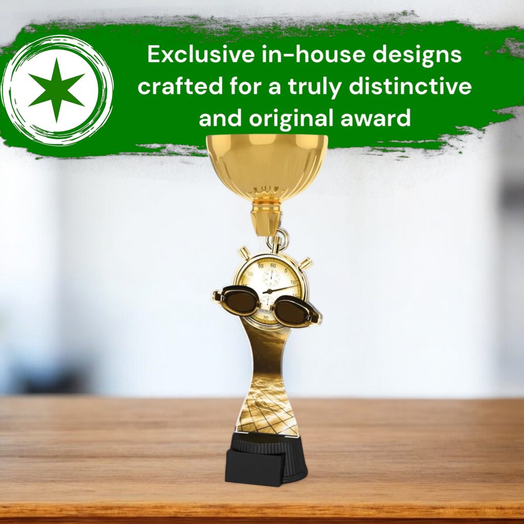 The Vancouver Classic Swimming Goggles And Stopwatch Gold Cup Trophy is a prestigious award that adds grandeur to any event.