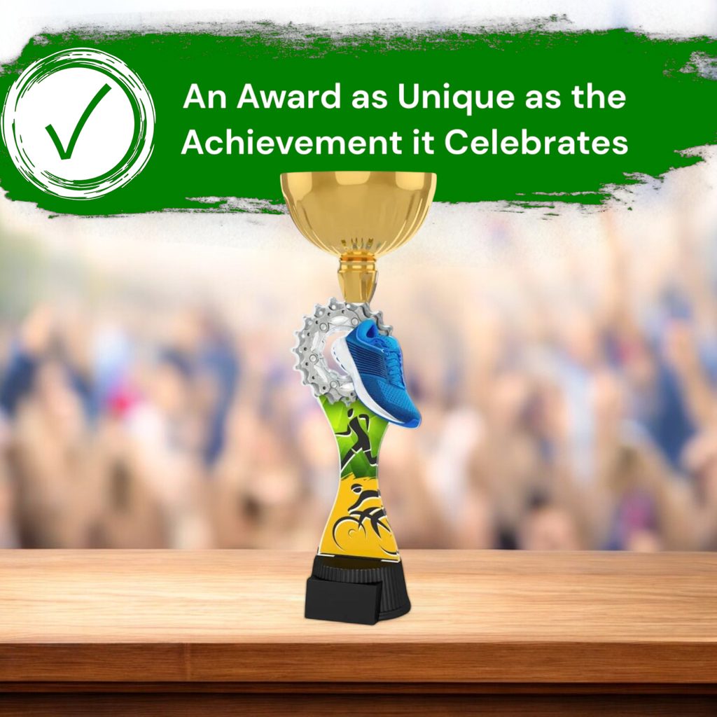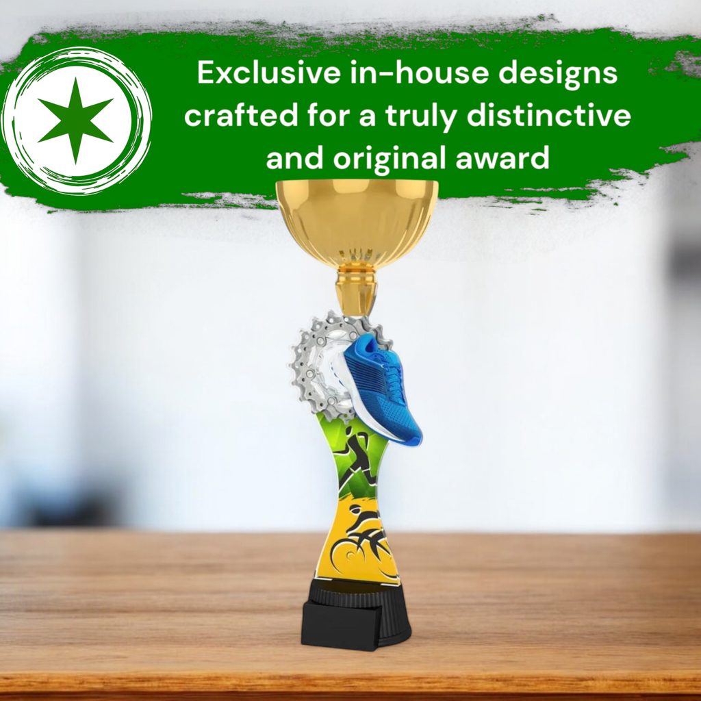 The Vancouver Duathlon Gold Cup Trophy is a prestigious award that adds grandeur to any event.