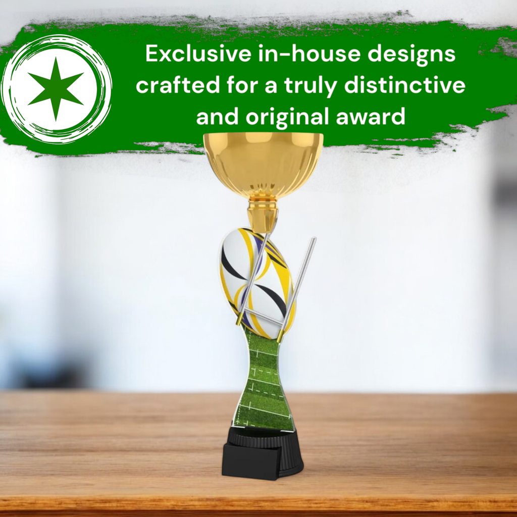 The Vancouver Rugby Ball And Goal Gold Cup Trophy is a prestigious award that adds grandeur to any event.
