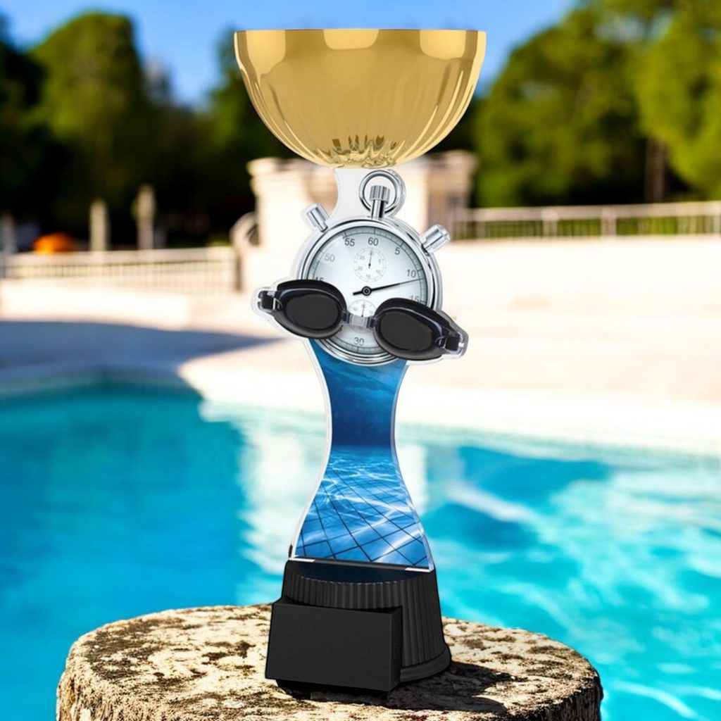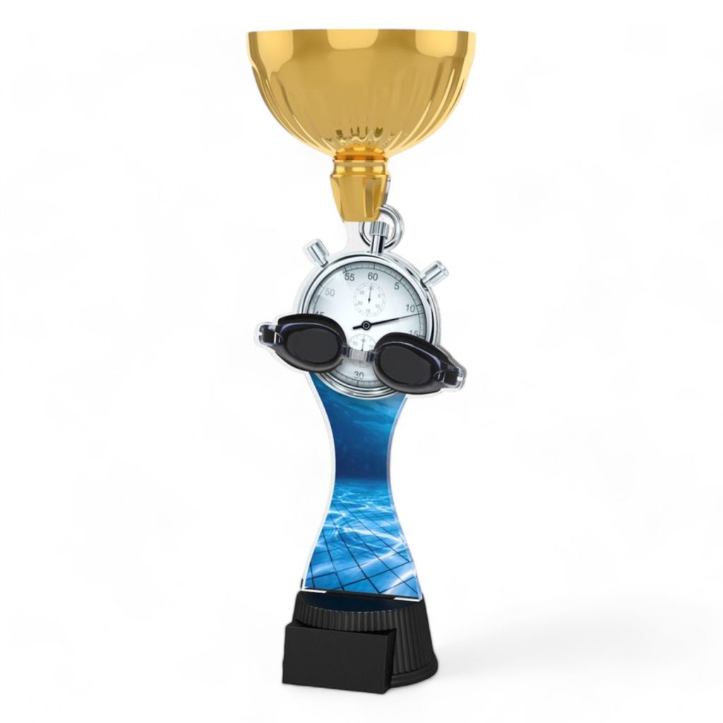 The Vancouver Swimming Goggles And Stopwatch Gold Cup Trophy is a prestigious award that adds grandeur to any event.