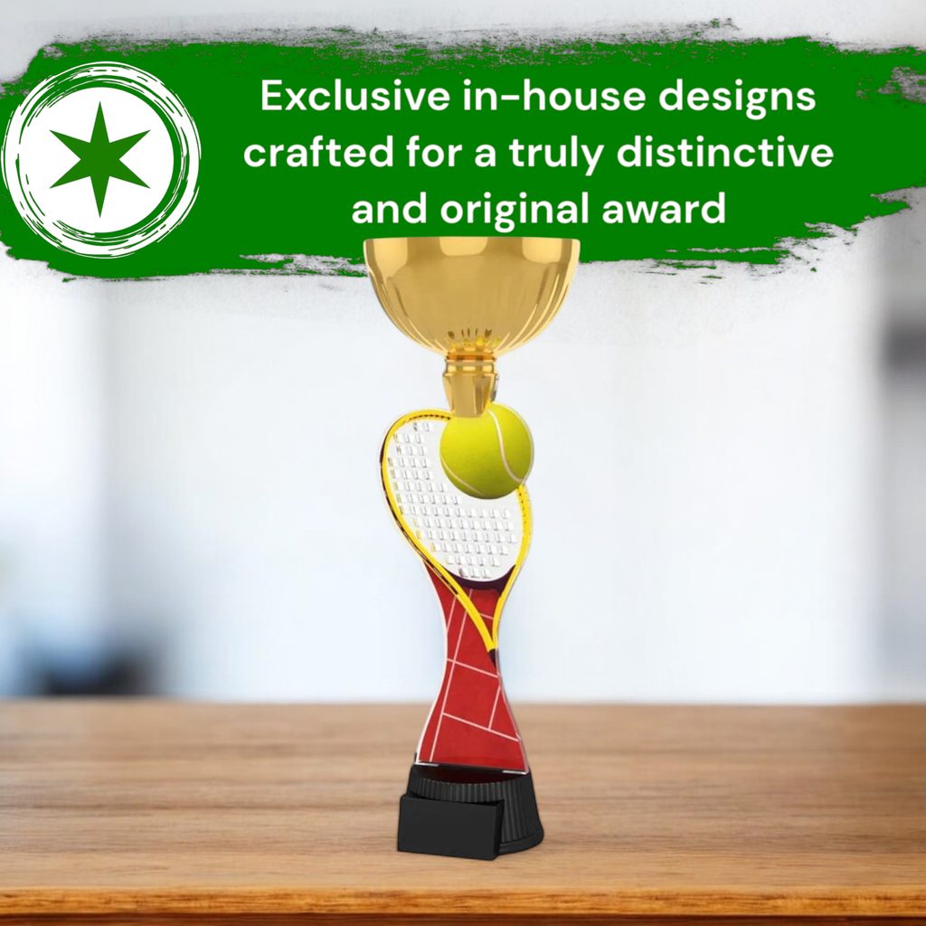 The Vancouver Tennis Racket And Ball Gold Cup Trophy is a prestigious award that adds grandeur to any event.