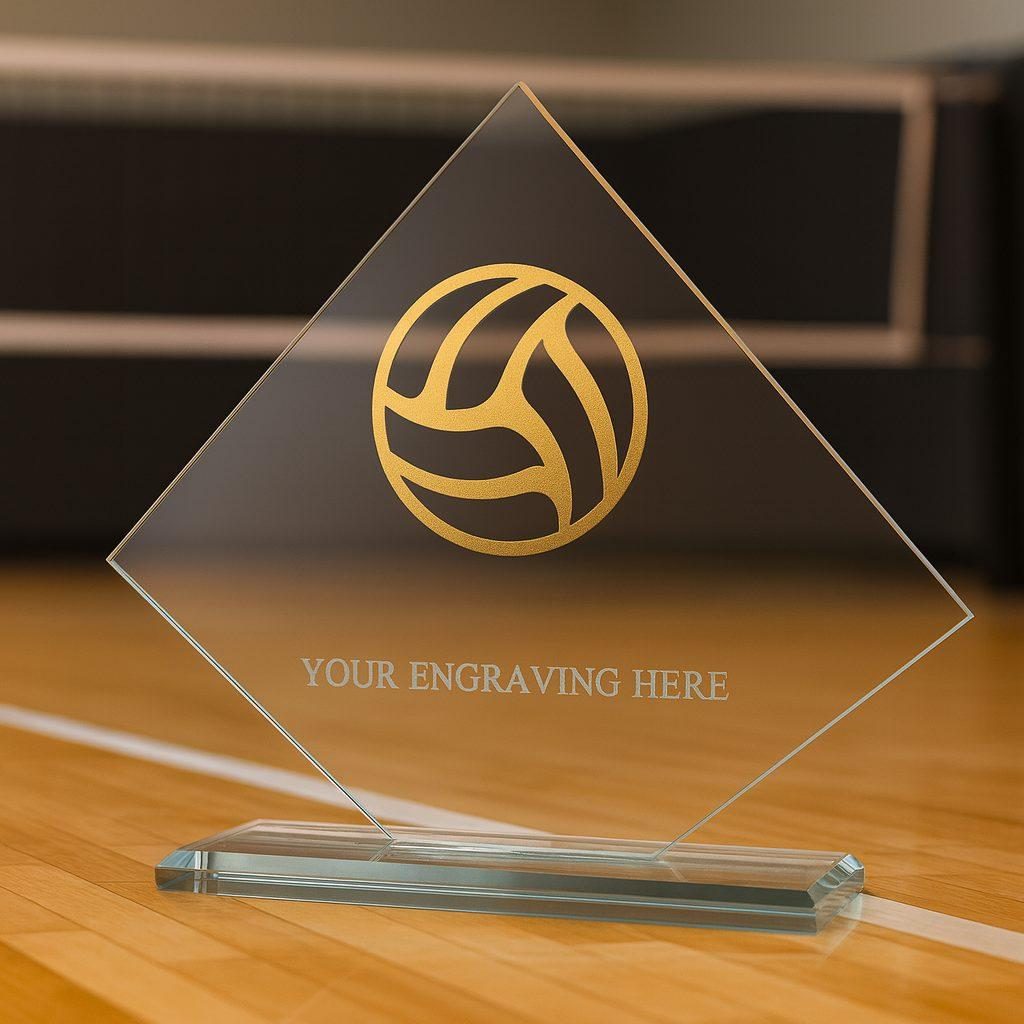 A stylish and modern trophy for basketball success – combining clear glass with a bold metal centrepiece for maximum impact.