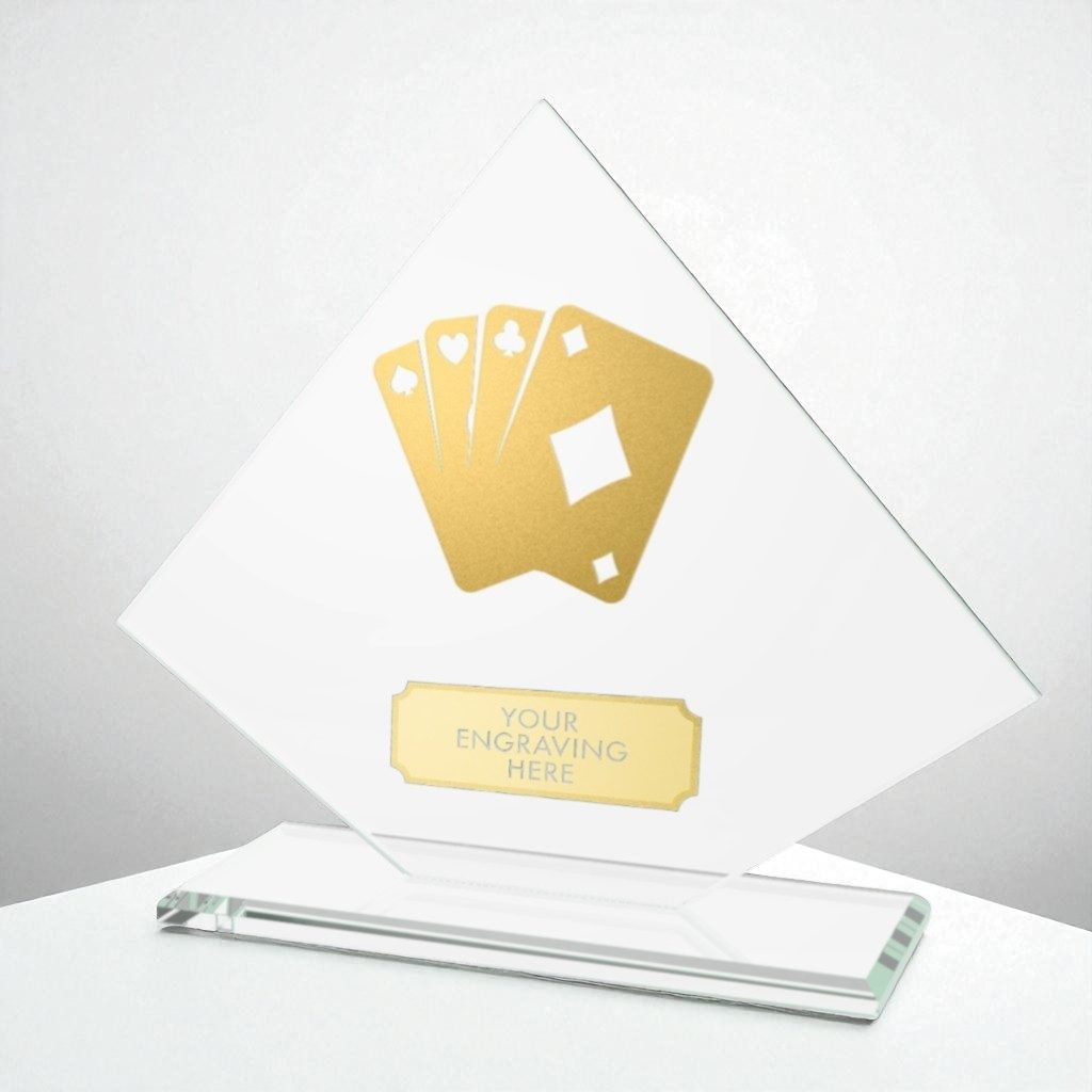 A modern glass trophy with a stainless steel card emblem – perfect for honouring card game champions and enthusiasts.