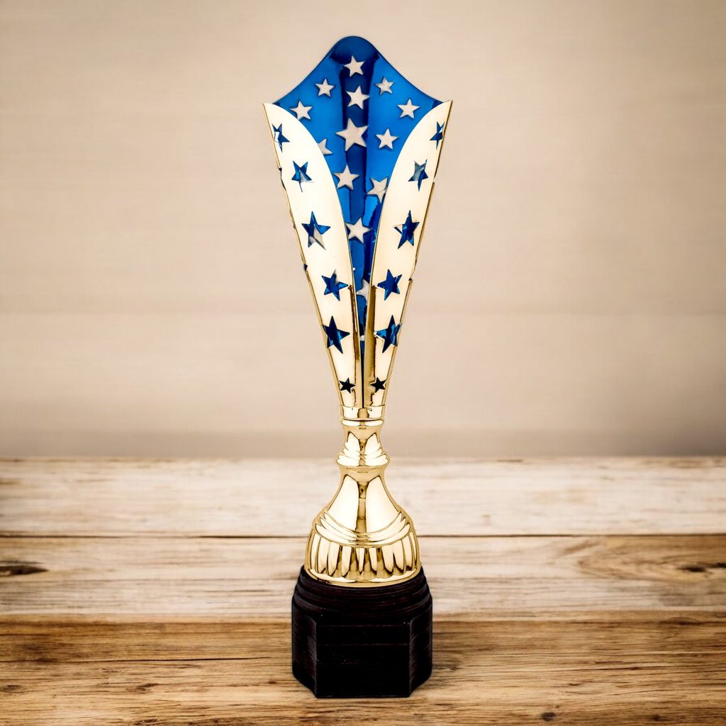 The Vector Gold & Blue Star Trophy is a striking modern award designed to celebrate outstanding achievement. Featuring a laser-cut gold metal star design with bold blue detailing, this tall, angular trophy is mounted on a sculpted stem and finished on a handcrafted real birch wood base.