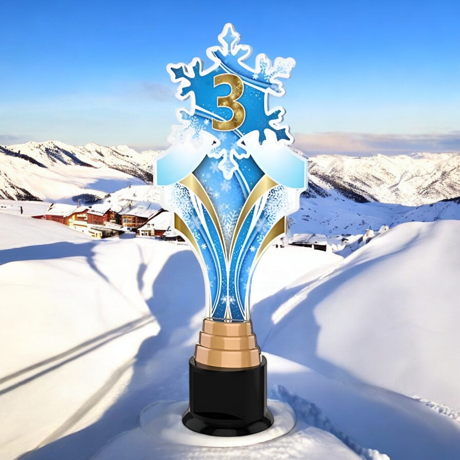 The Verbier Trophy is a tall modern style award mounted on a circular PVC base. With a winter theme it is cut to shape leaving a clever snowflake impression. The trophy features a high quality full colour print on the reverse side of the 6mm thick acrylic. Just above the base sits a bronze riser.