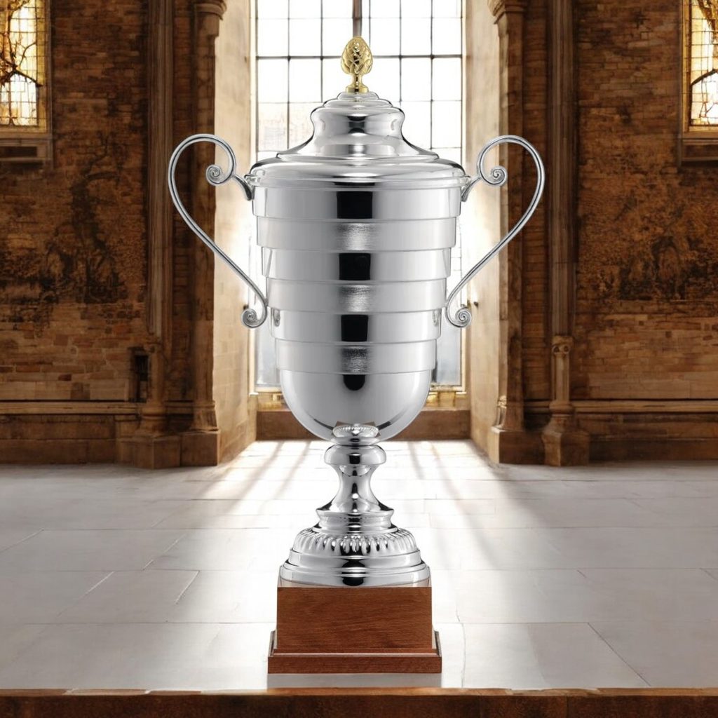 The Verratti Silver Plated Metal Trophy is a refined, architectural award with a commanding presence. Featuring a fixed lid and elegant handled design, this striking trophy is built for major competitions and top-tier presentations.