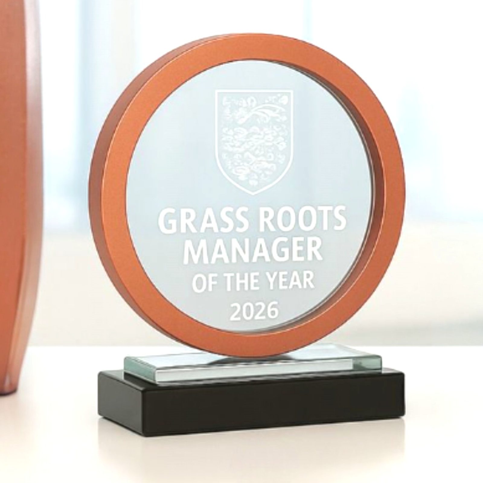 Present excellence with the Vetra Bronze Engraved Glass Award, a luxurious circular design featuring a 15mm thick glass panel encased in a radiant brozne border. Standing 175mm tall, it’s mounted on a clear glass base with an additional black wooden plinth for added height and gravitas. A presentation box is included.