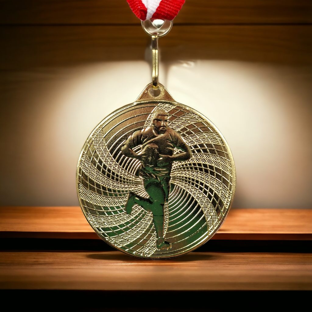 Typhoon Rugby Gold Medal is a fantastic medal made from stamped iron. A heavy feel with a professional finish, this medal will prove popular in any presentation.
