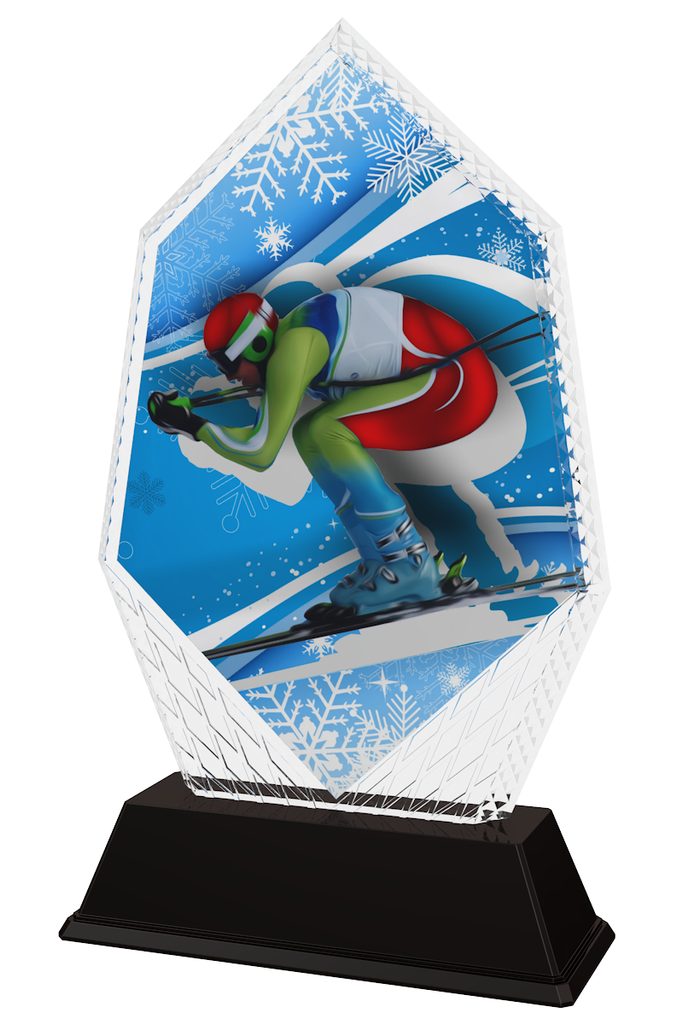 The Whistler Skier Trophy has been developed using a special patterned 8mm acrylic mounted on a black PVC base. The feature of the Whistler range is its unique winter-blue based high quality print.