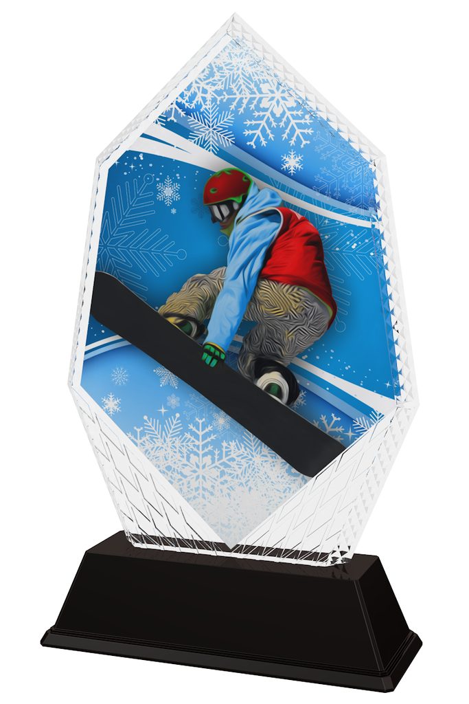 The Whistler Snowboarder Trophy has been developed using a special patterned 8mm acrylic mounted on a black PVC base. The feature of the Whistler range is its unique winter-blue based high quality print.